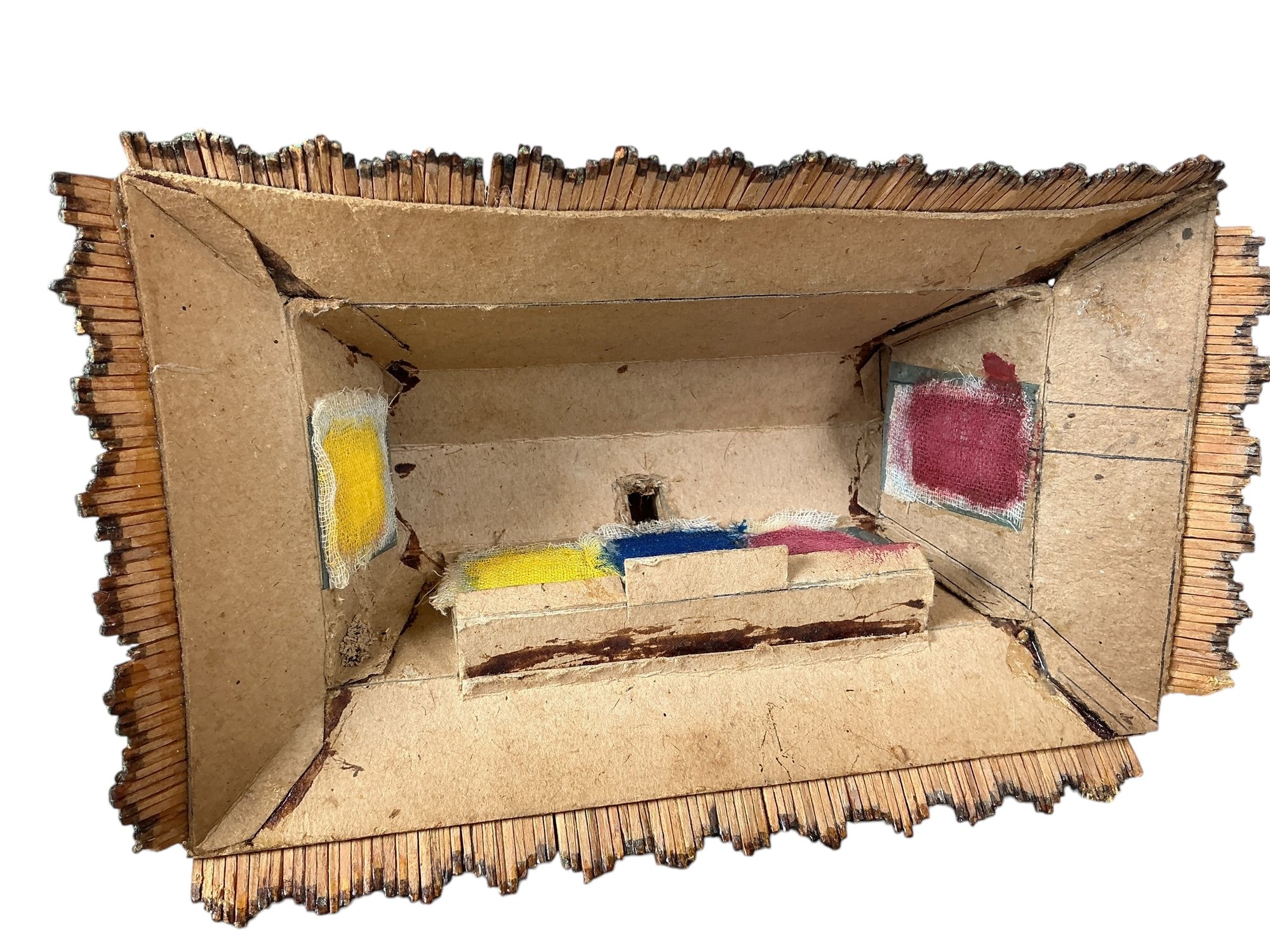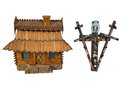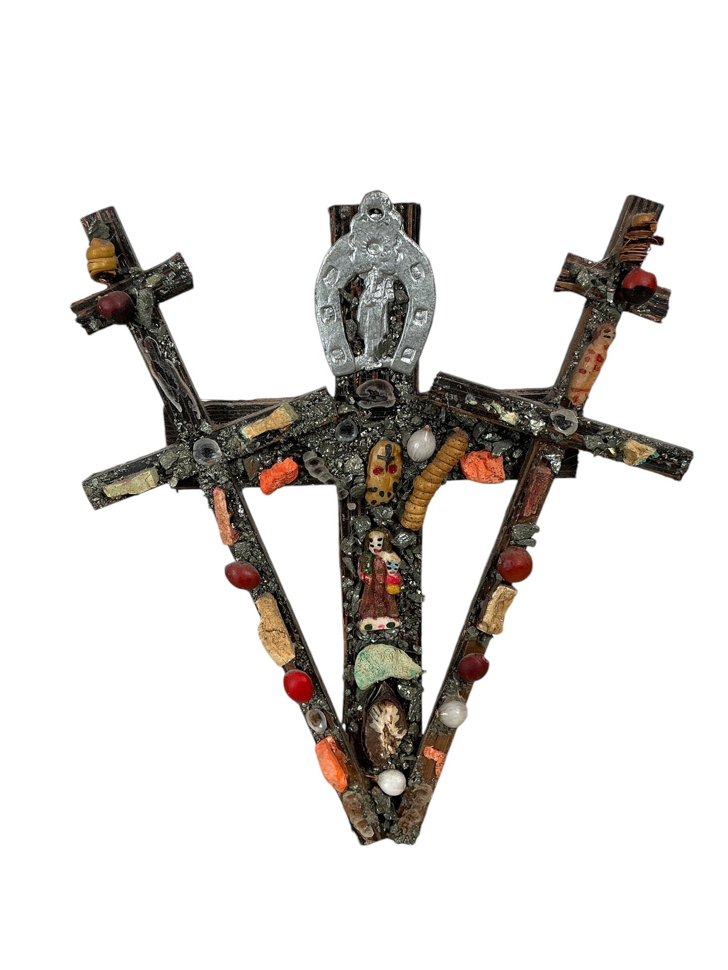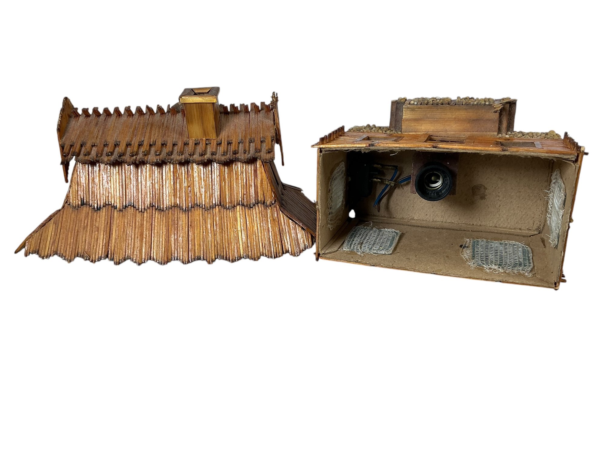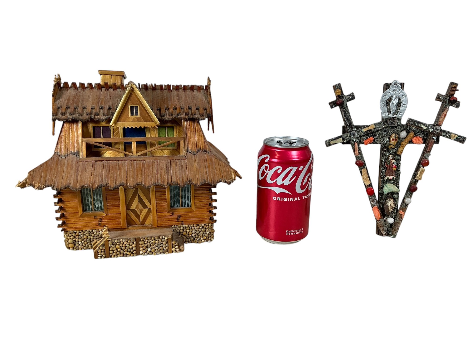 Folk Art Matchstick Art Cottage Lamp And Crucifix. Small missing pieces on both, please see photos. The cottage form lamp is approx. 8” tall.