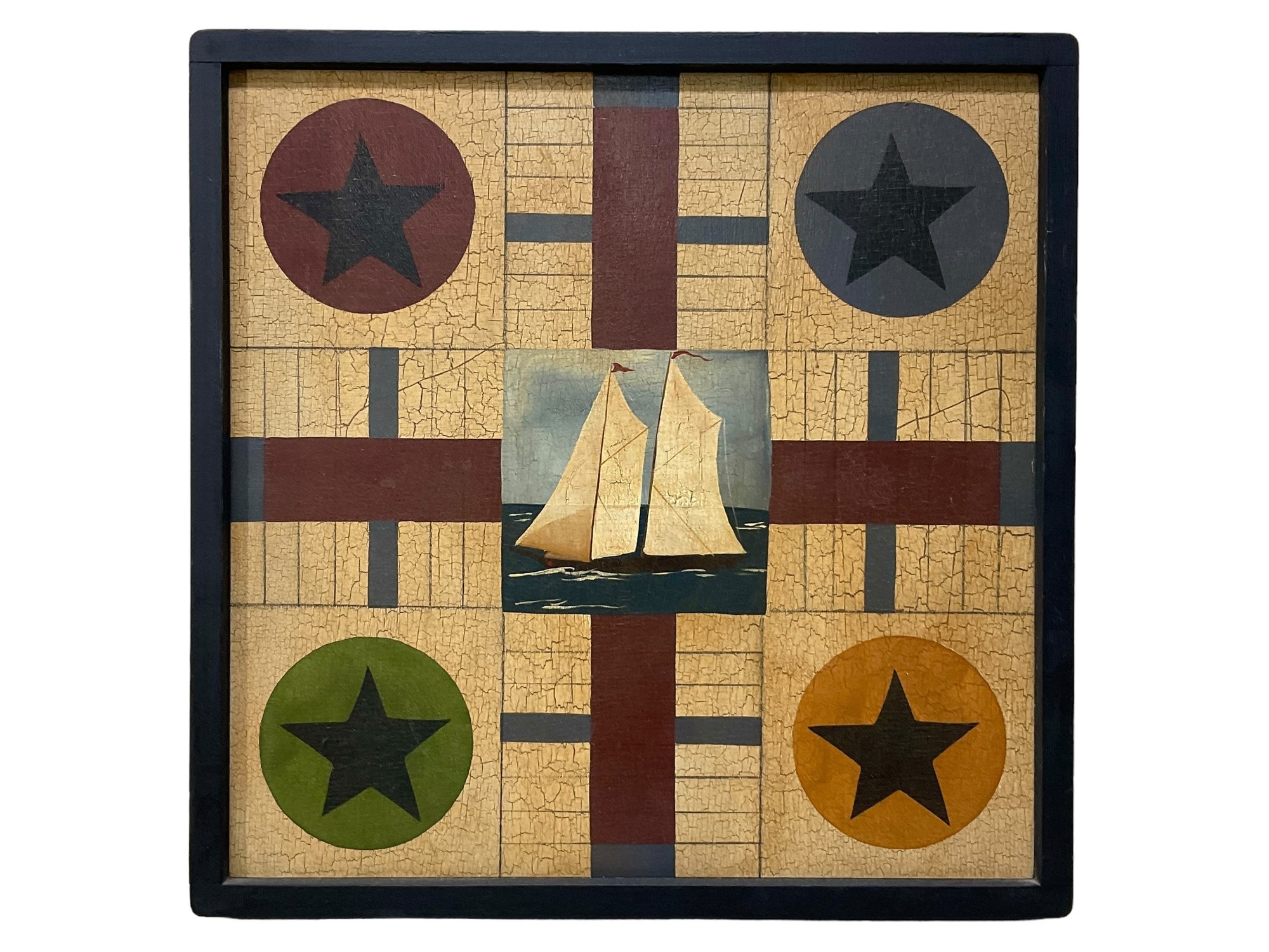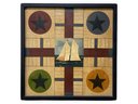 Folk Art Wooden Parcheesi Board, this is not an antique, but it is solid wood and appears hand painted. Measures 15” x 15” and 1.5” thick.