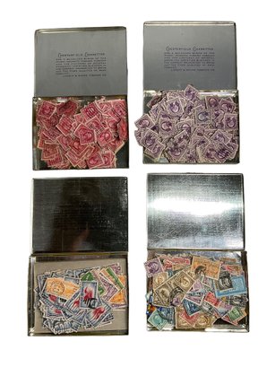 Four 1930s Chesterfield Cigarette Tins With US Postage Stamps Collection 2 3 Cents Assorted Airmail Etc. In good condition. Each tin is 5.5” by 4.5”.