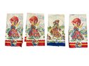 Four 1950s Cotton Barkcloth Mexican Theme Large Napkins Kitsch. Three are the same design and one is different. All are in good used condition with some light age stains. Each is approx. 15” by 28”.