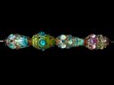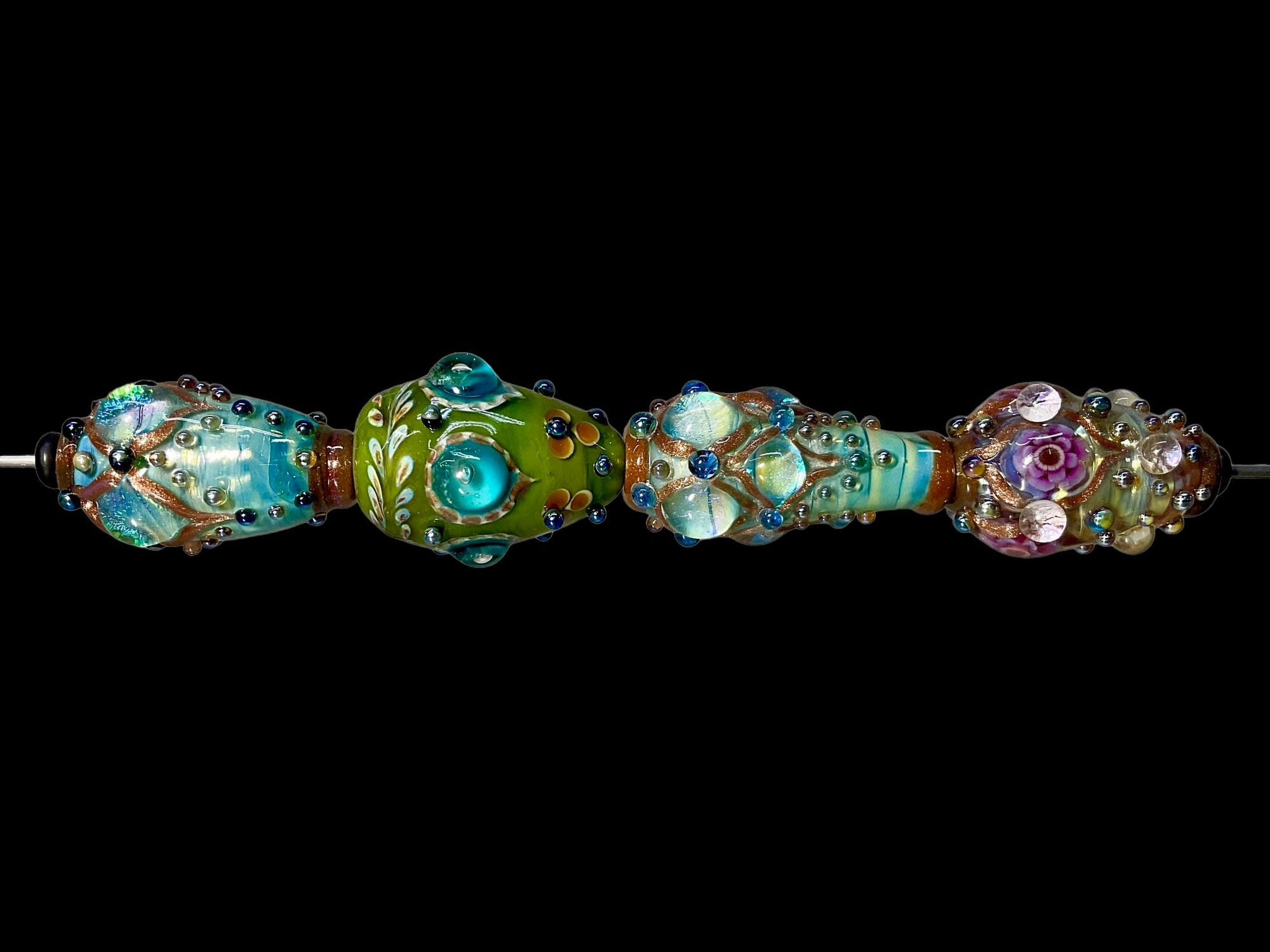 Four Boho Art Glass Lamp Work Beads Intricate Designs, largest measures 1.5” in length. Each one of a kind and hand made.