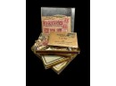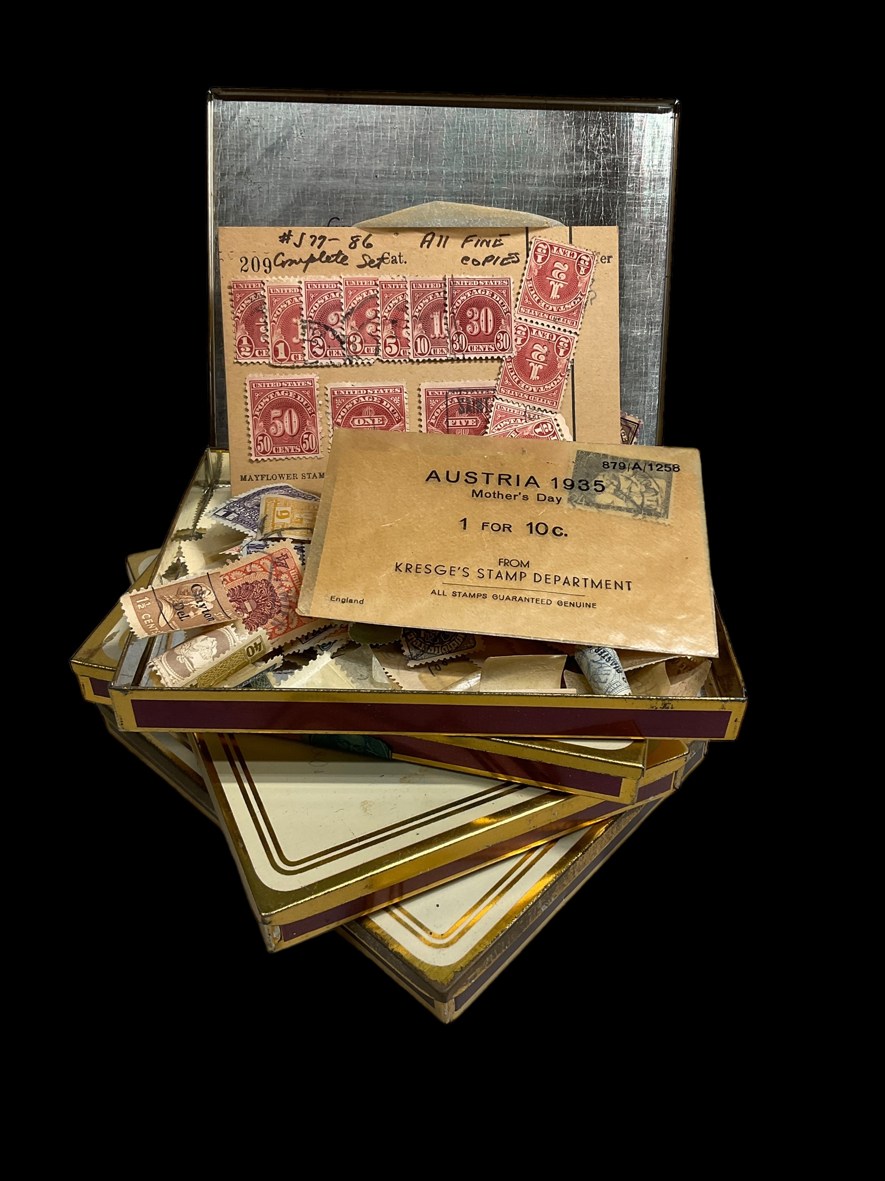 Four Vintage 1930s Chesterfield Cigarette Tins With Stamps Austria US Canada Newfoundland Etc. Please see photos for condition.