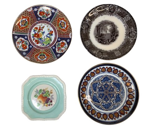 Four Vintage And Antique Decorative Plates Purple Transfer Ware Imari Johnson Bros. The purple transfer ware plate has some chips and cracks the others are in good used condition. The largest is 10” in diameter.