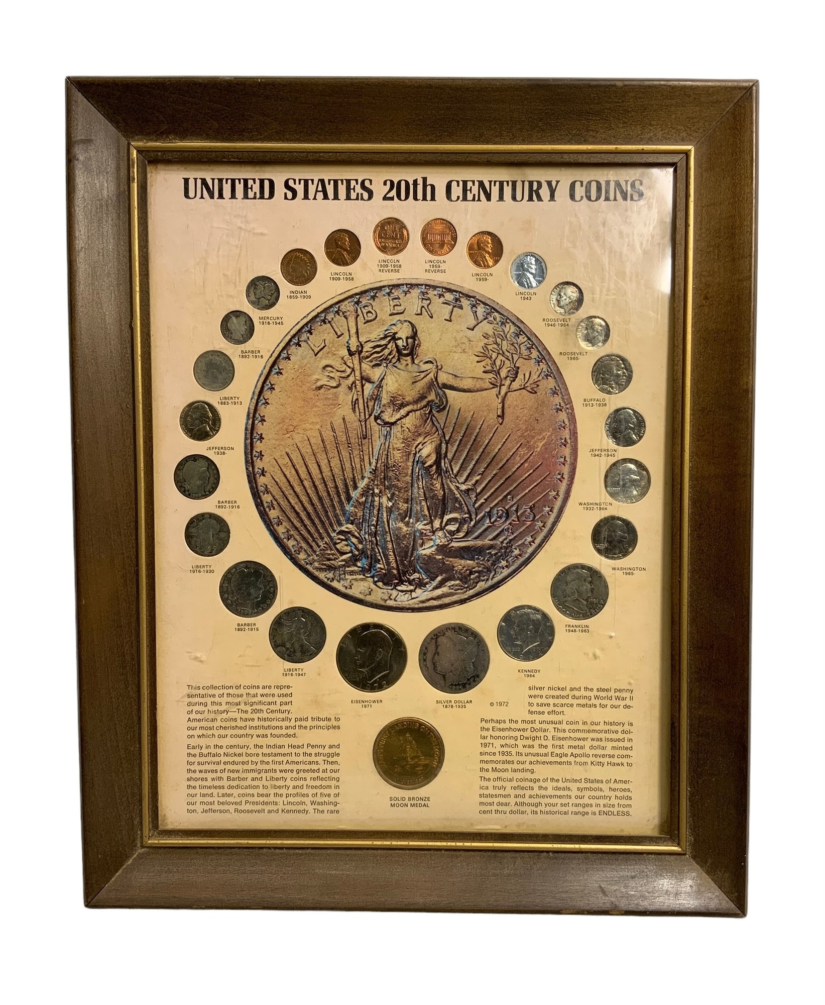 Framed Antique Coins Morgan Silver Dollar Barber Half Dime Nickel Moon Landing Medal Etc. In good condition. It is approx. 16.5” by 13.5”.