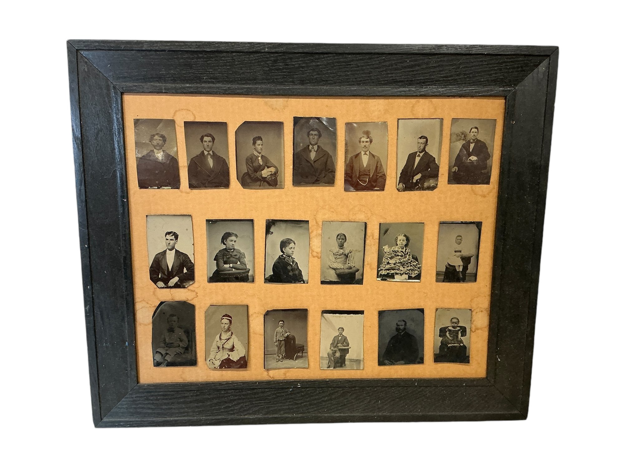 Framed Collection Of Eighteen Antique Tintype Portraits. All in fair to good condition, but please be aware these have been taped onto the cardboard backing. The frame size is approx. 20.5” by 24.5.”