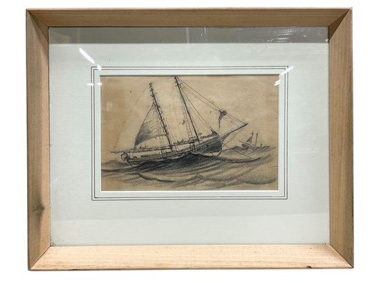 Framed Pencil Drawing Of Ship Vintage Or Antique, sight size measures 5.5” x 8.5.”