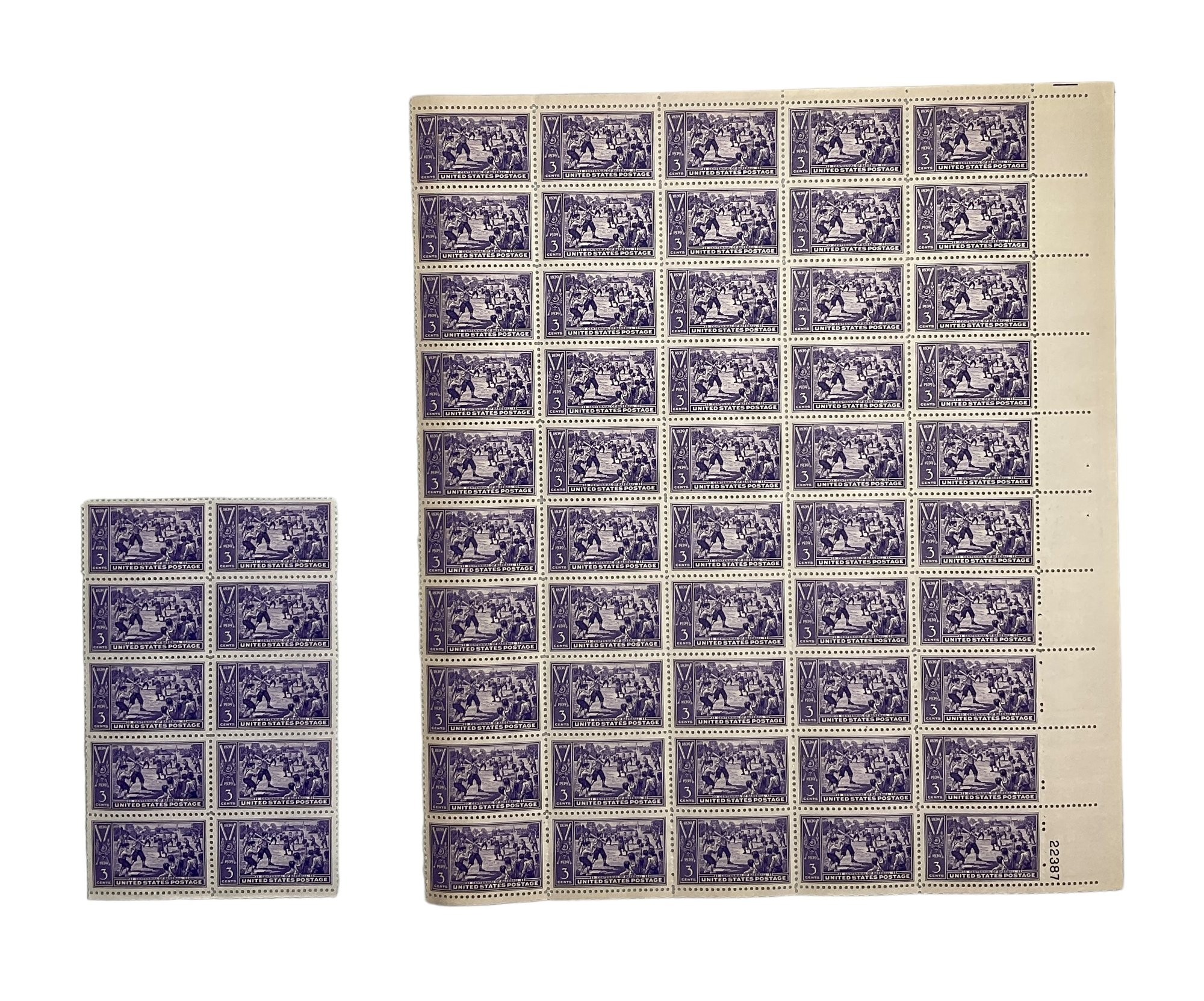 Full Sheet Of 1939 Centennial Of Baseball 3 Cents Postage Stamps Plus 10 Extras. Both in good condition.
