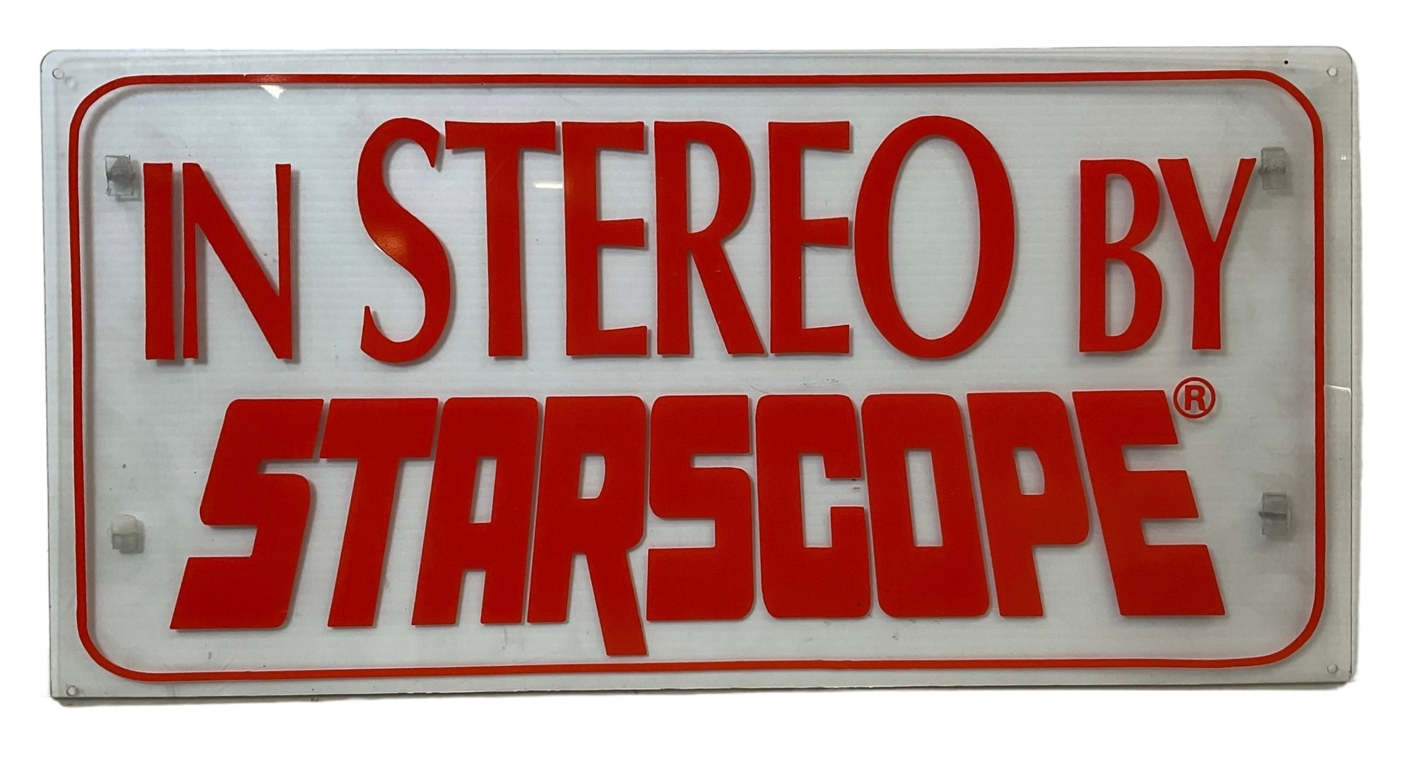 Funky 80s In Stereo By Starscope Clear Plexiglass Advertising Sign. In good condition with minor wear. It is approx. 13” by 26.”