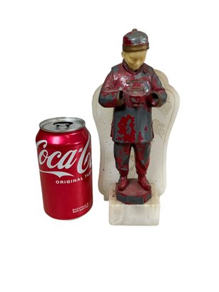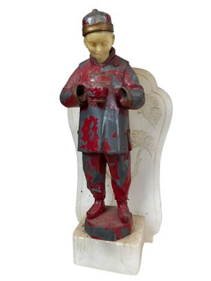 Funky Chinese Boy In Traditional Dress Soapstone And Pot Metal Bookend. In fair condition with missing hands and flaking paint, please see photos. It is approx. 8.5” tall.