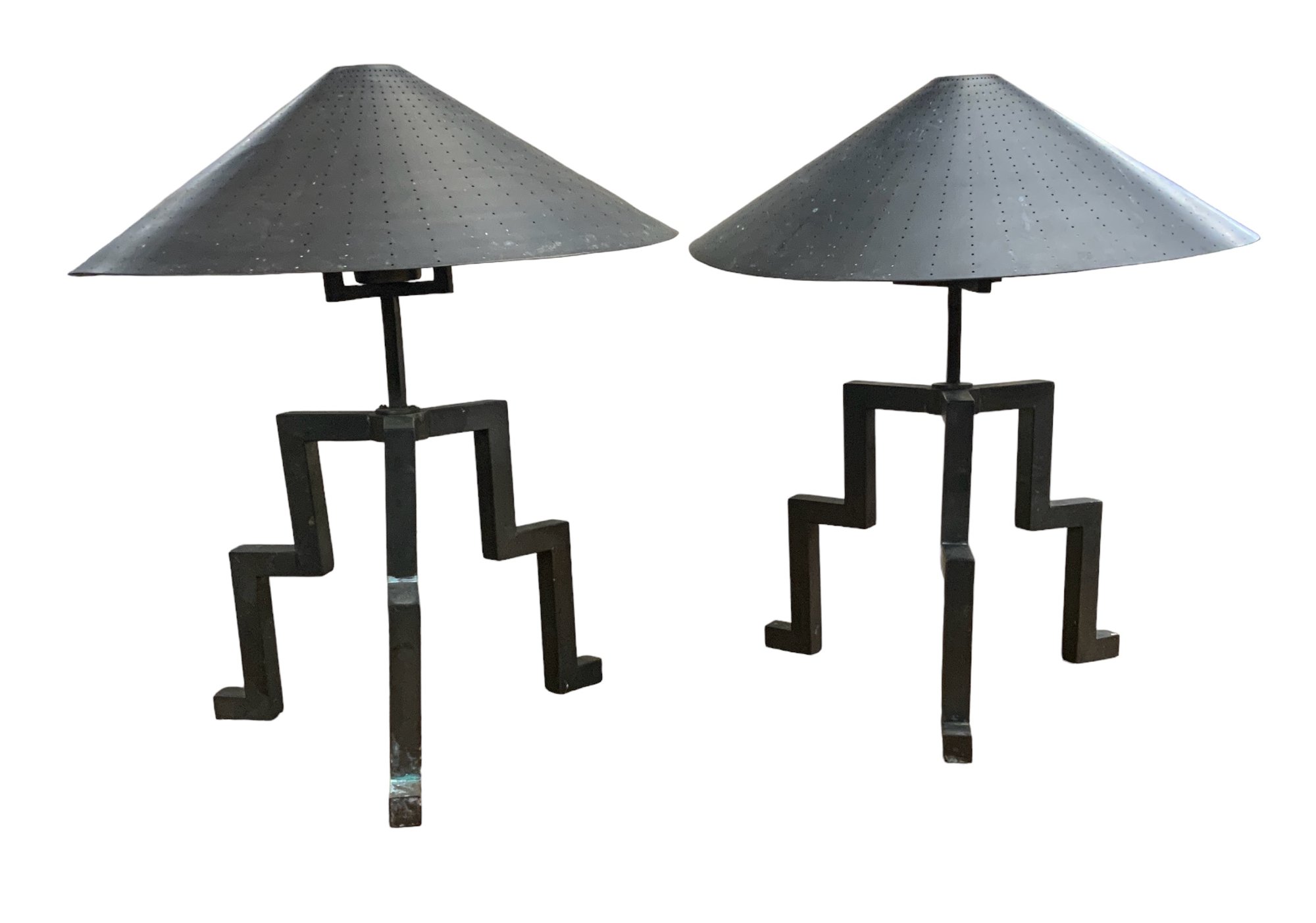Funky Pair Of Modernist Copper Zig Zag Lamps With Shades. In fair condition with a damaged top cup, please see photos. They are approx. 22” tall and the shades have a diameter of 20”.