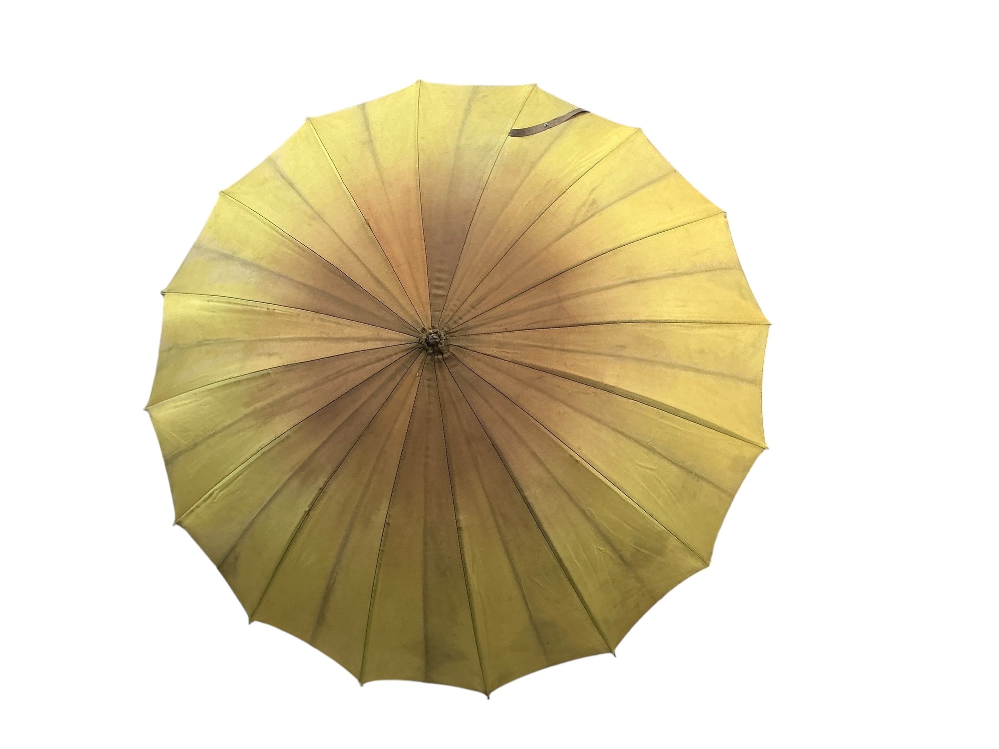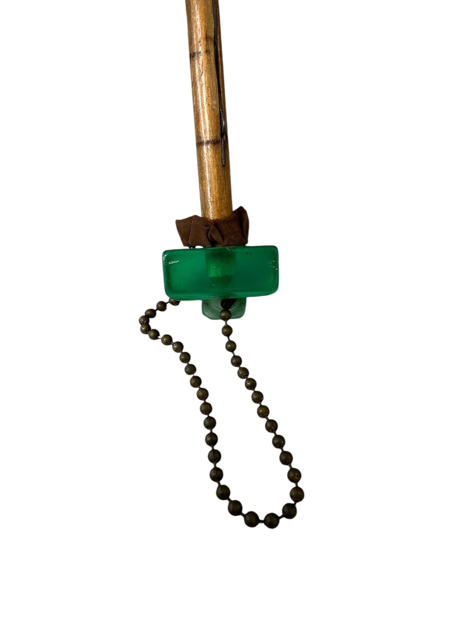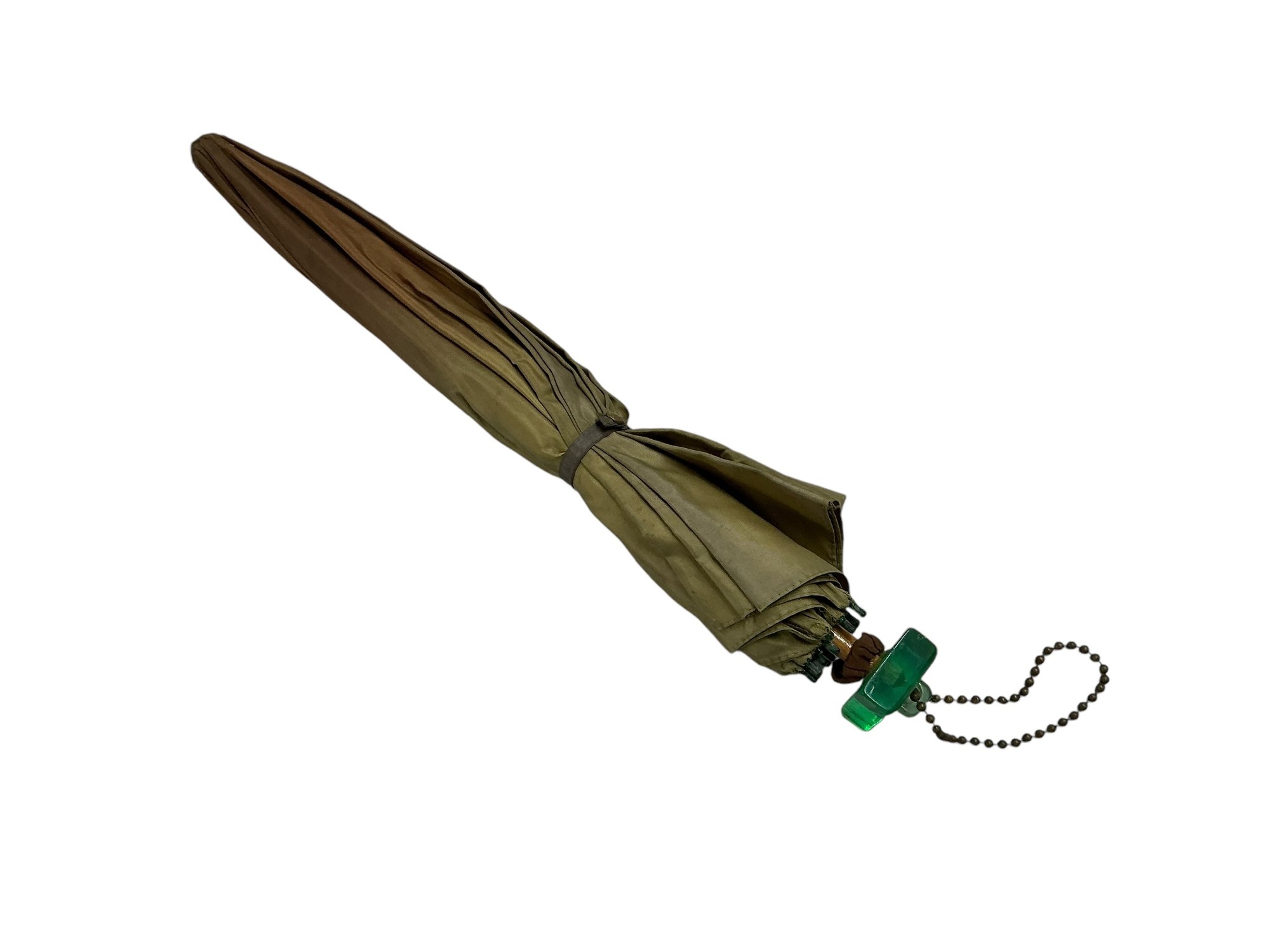 Funky Vintage/Antique Green Fabric Parasol With Chunky Green Bakelite/Early Plastic Handle. The fabric is most likely synthetic. In good condition, opens easily, and is tight as a drum but has age darkening to the top, please see photos. Closed it is approx. 19” long.