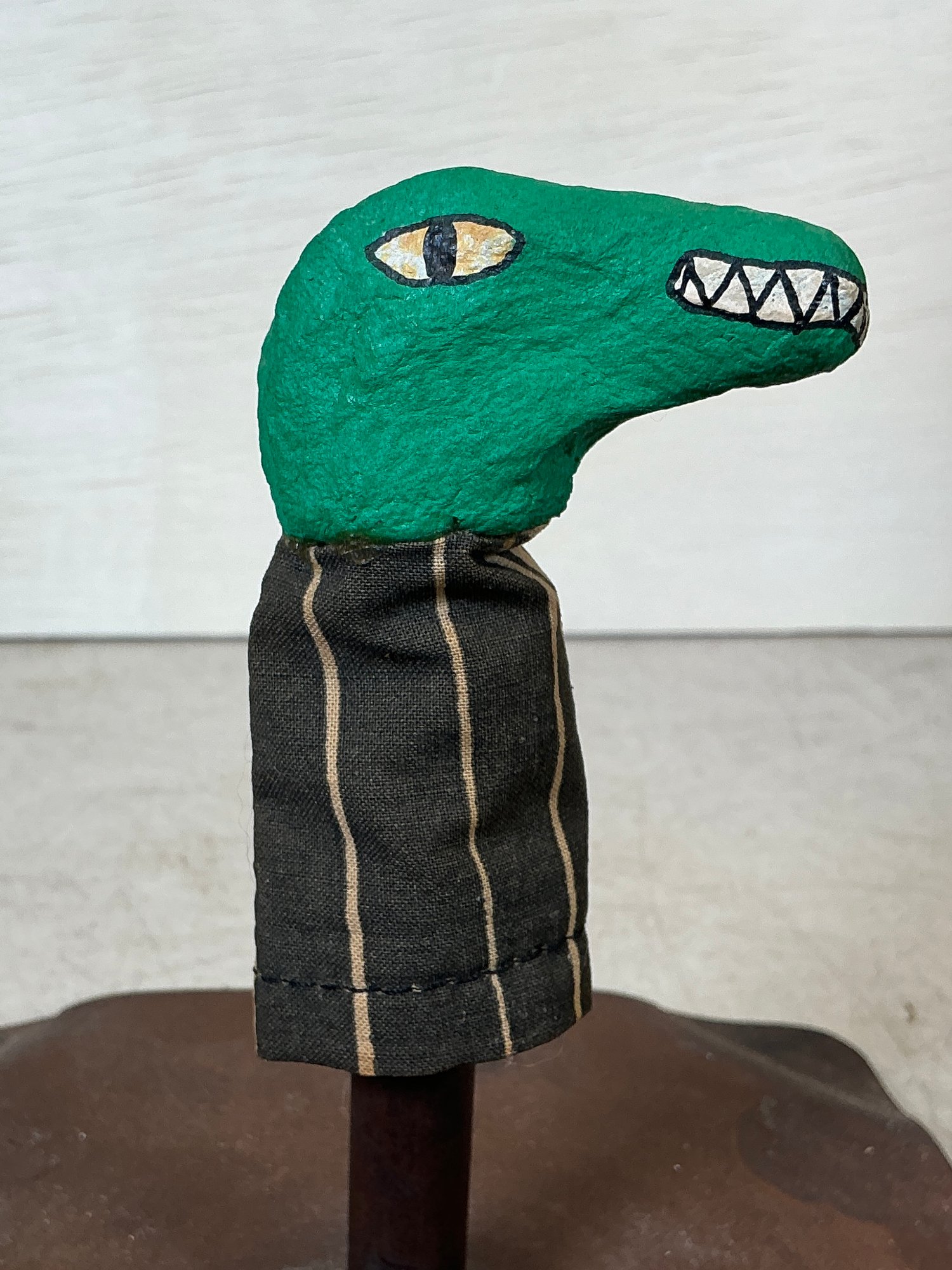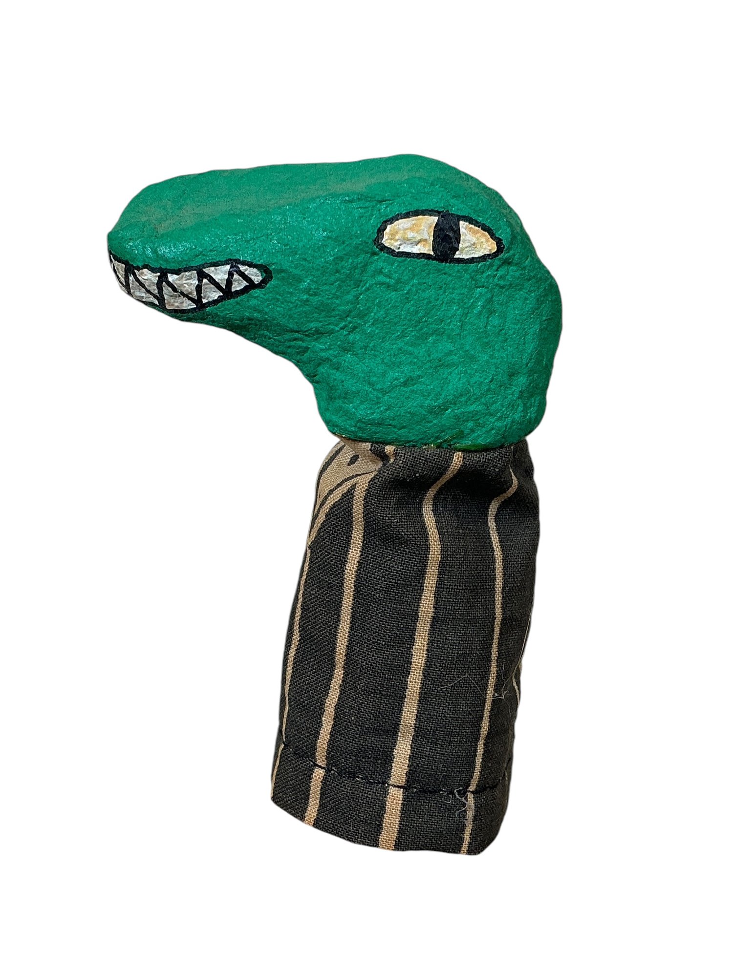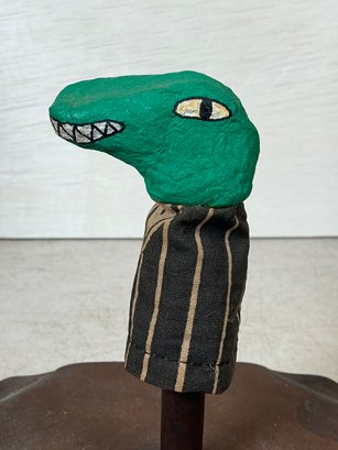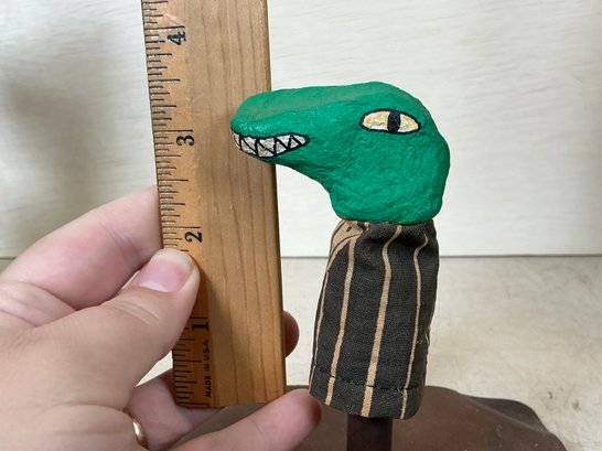 Funny Little Paper Mache Alligator Finger Puppet, measuring 3.25” tall.