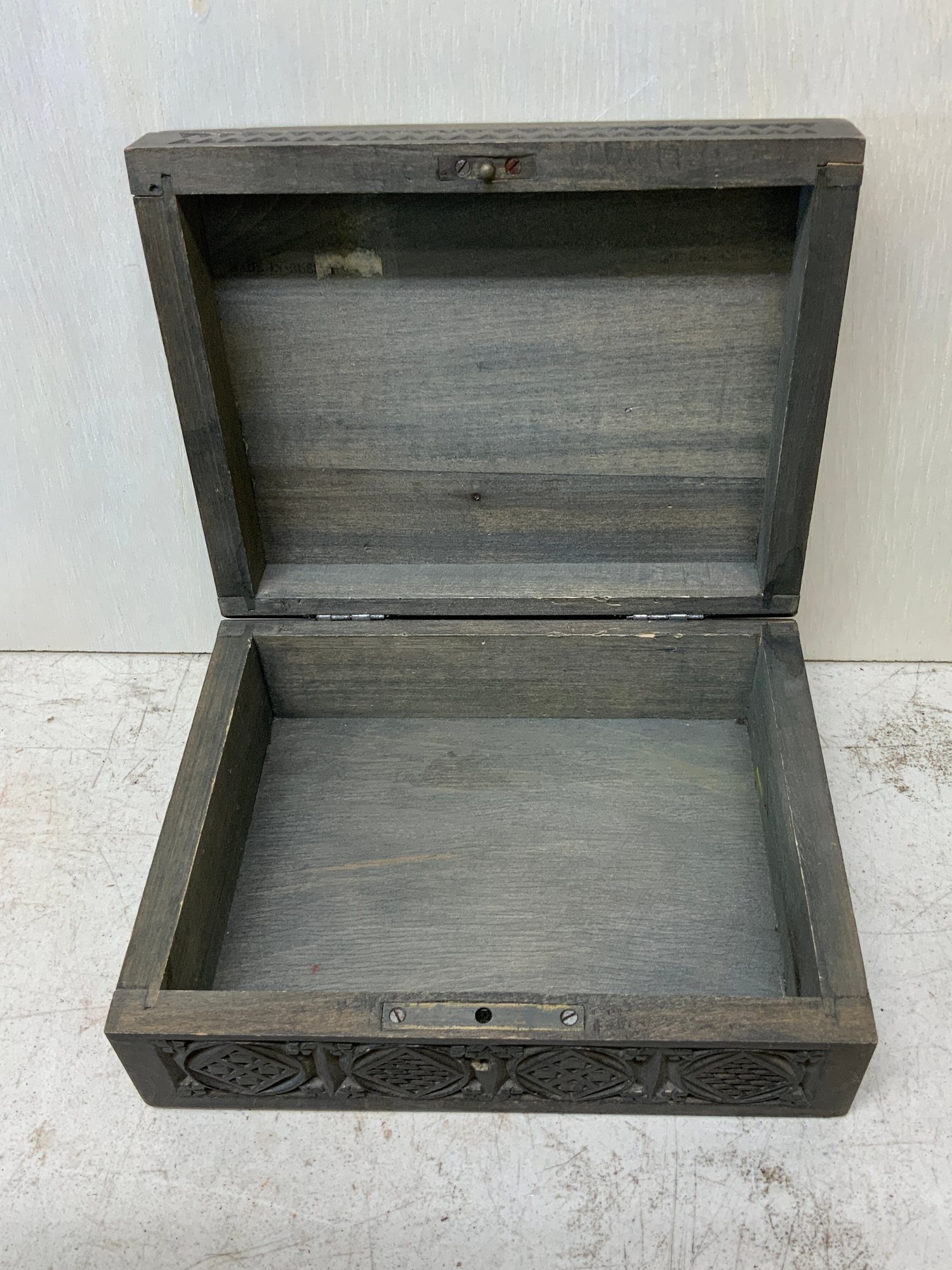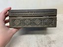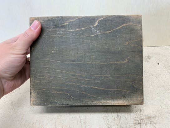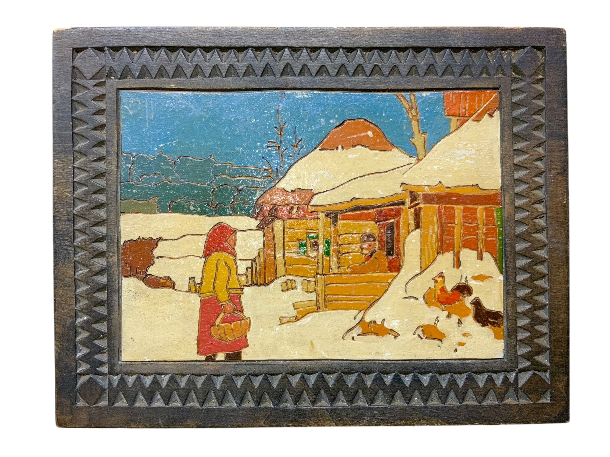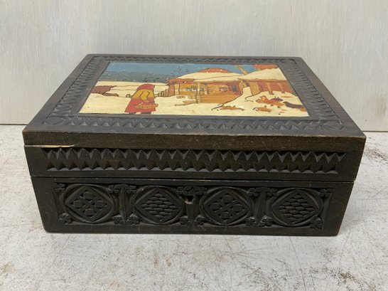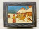 Hand painted Russian folk art box, woman in snowy scene, measures 7.5” x 6” x 3.”