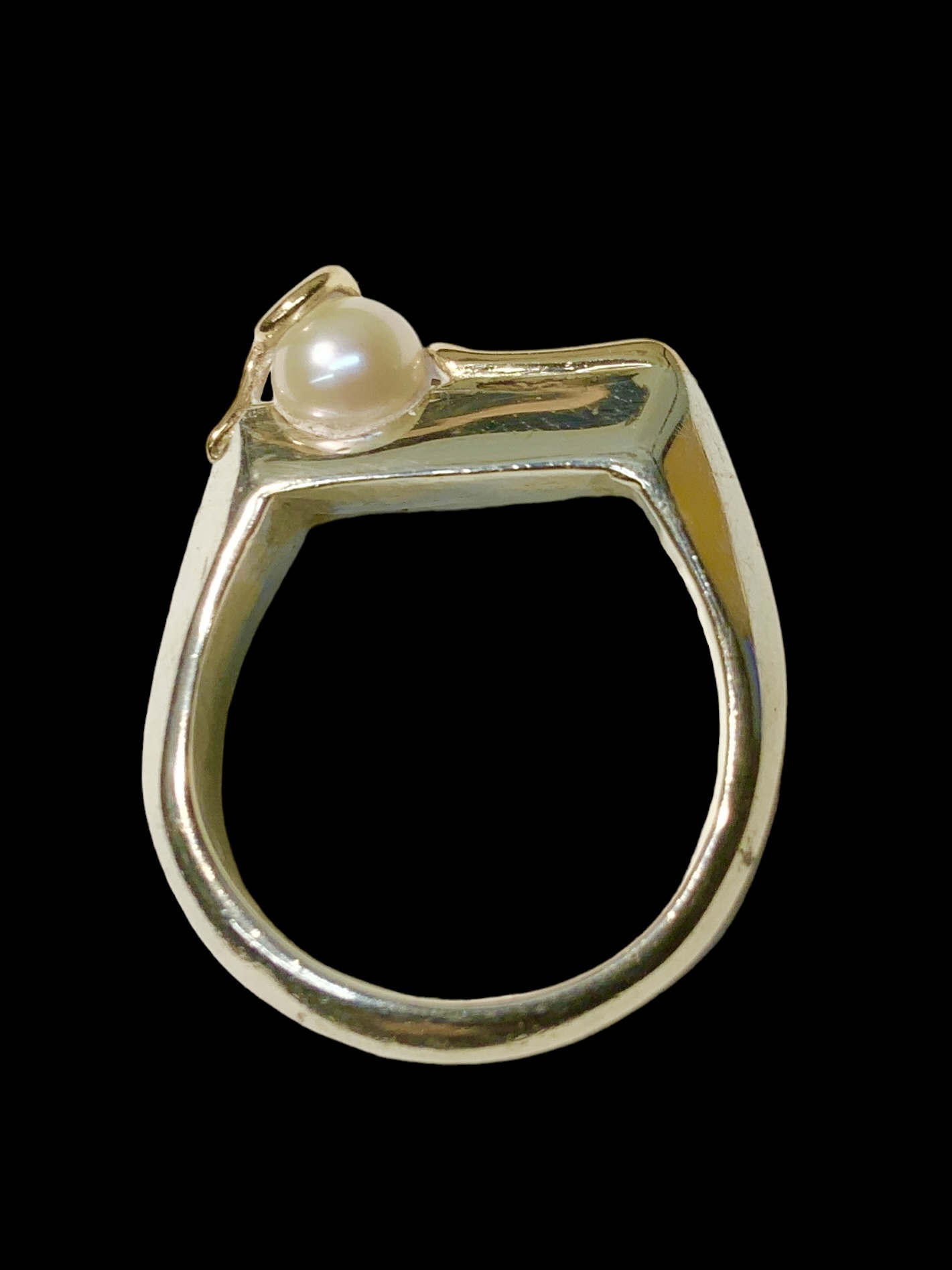 Hand-Wrought Sterling And Pearl Ring, interesting and unusual design. Appears to have been originally signed by the artist but it’s worn down/unreadable. A size 6. Very comfortable shape for everyday wear. The contrasting metal running along the pearl has been untested, is either brass or gold. Definitely one of a kind.