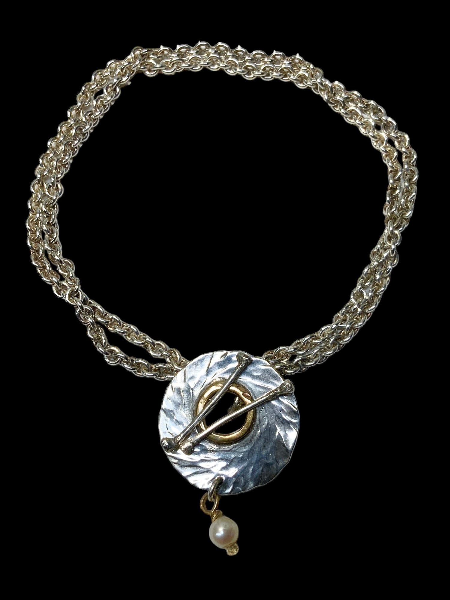 Hand-Wrought Sterling Artisan Made Necklace And Brooch Combo, 19” total length. Pearl is authentic. This necklace has a very interesting clasping mechanism. You loop the two T shaped anchors at the end of the chain on either side through the hole in the center of the brooch. Can also be worn as a brooch by itself. Signed on the back, “Wind, Sterling, Bronze GF” Definitely one of a kind.