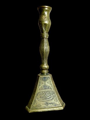 Heavy Bronze Middle Eastern Candle Stick, measures 12” tall. Arabic writing and design.