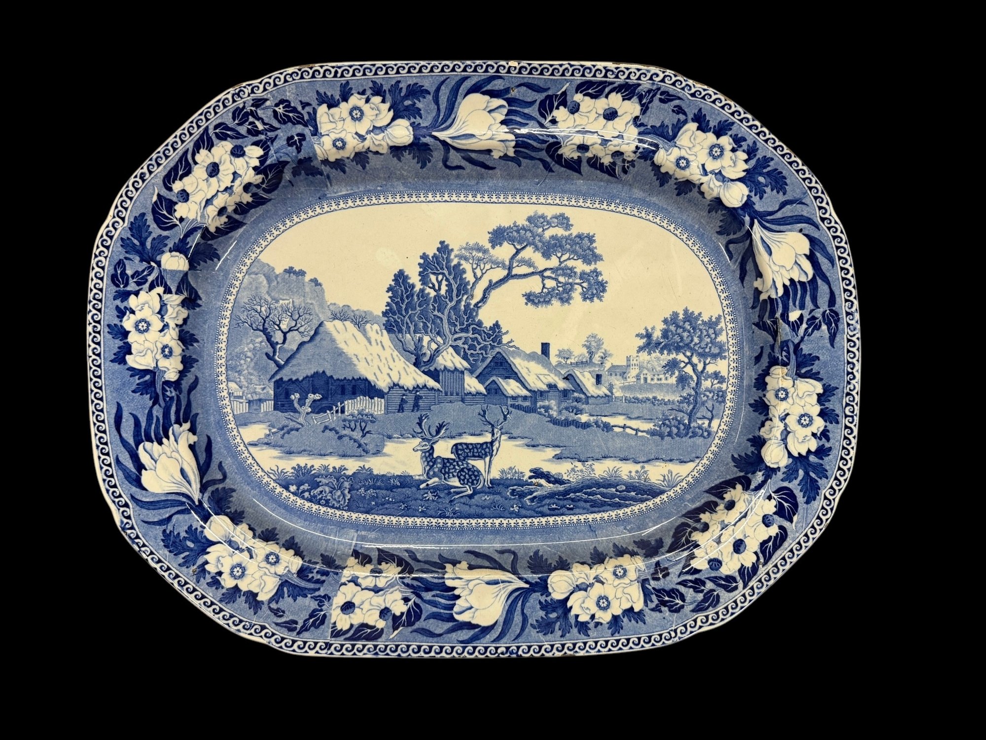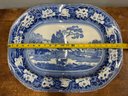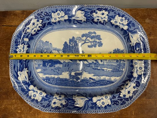 Huge 21" X 16" Antique Blue Transfer-ware Rogers Ironstone Platter With Deer By Village. It's in near mint condition, with only the smallest bit of glaze (not chipped) worn at the corners. It's getting hard to find them in this size in such condition!