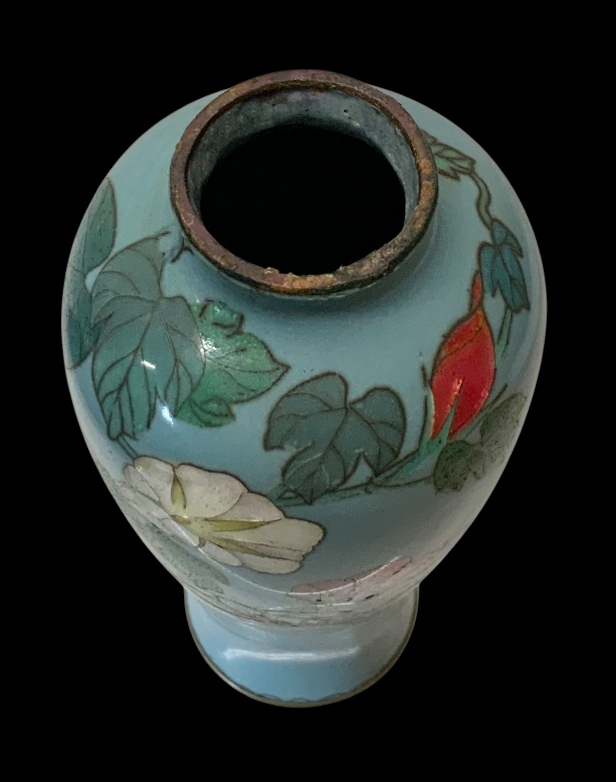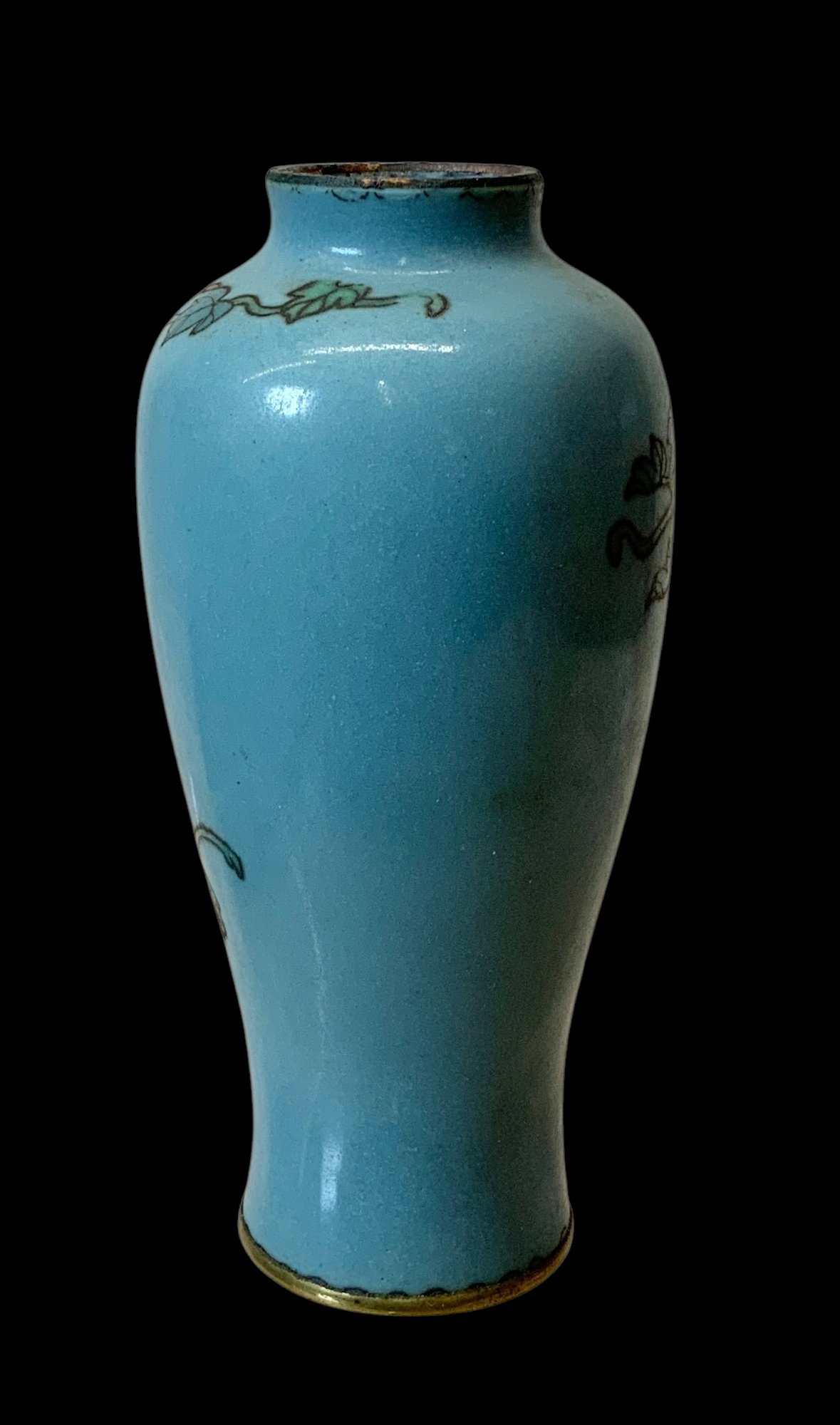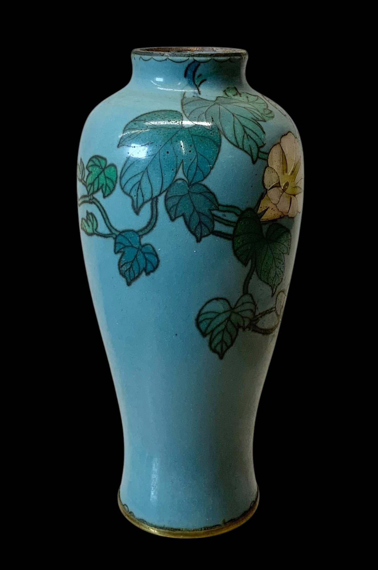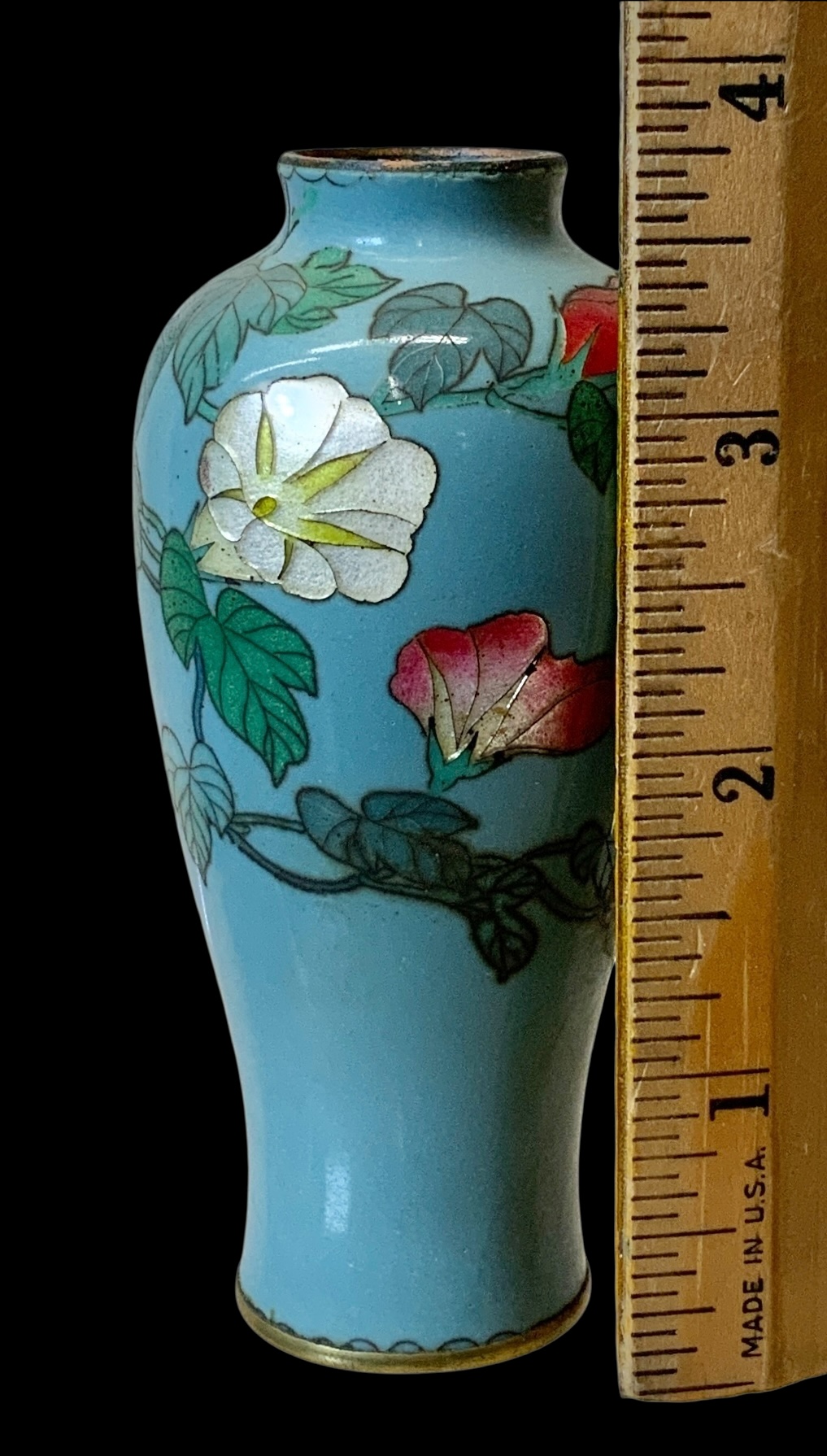 Japanese Miniature Cloisonné Enamel Floral Vase. Miniature vase depicts white and pink cloisonné enamel flowers on a vine against a light blue background. No visible cracks or chips, vibrant in color. Measures approximately 3.75” tall.