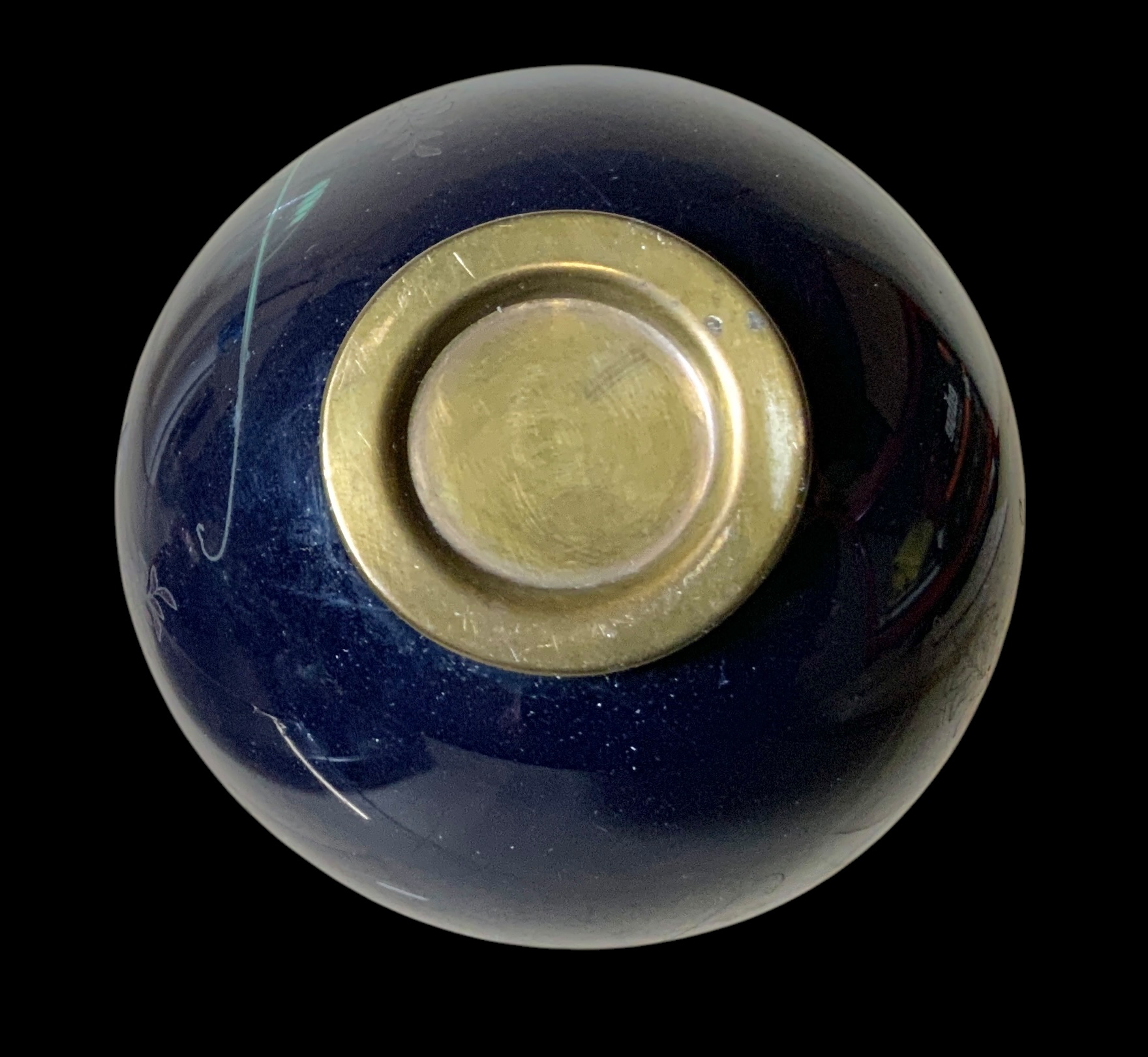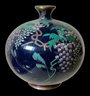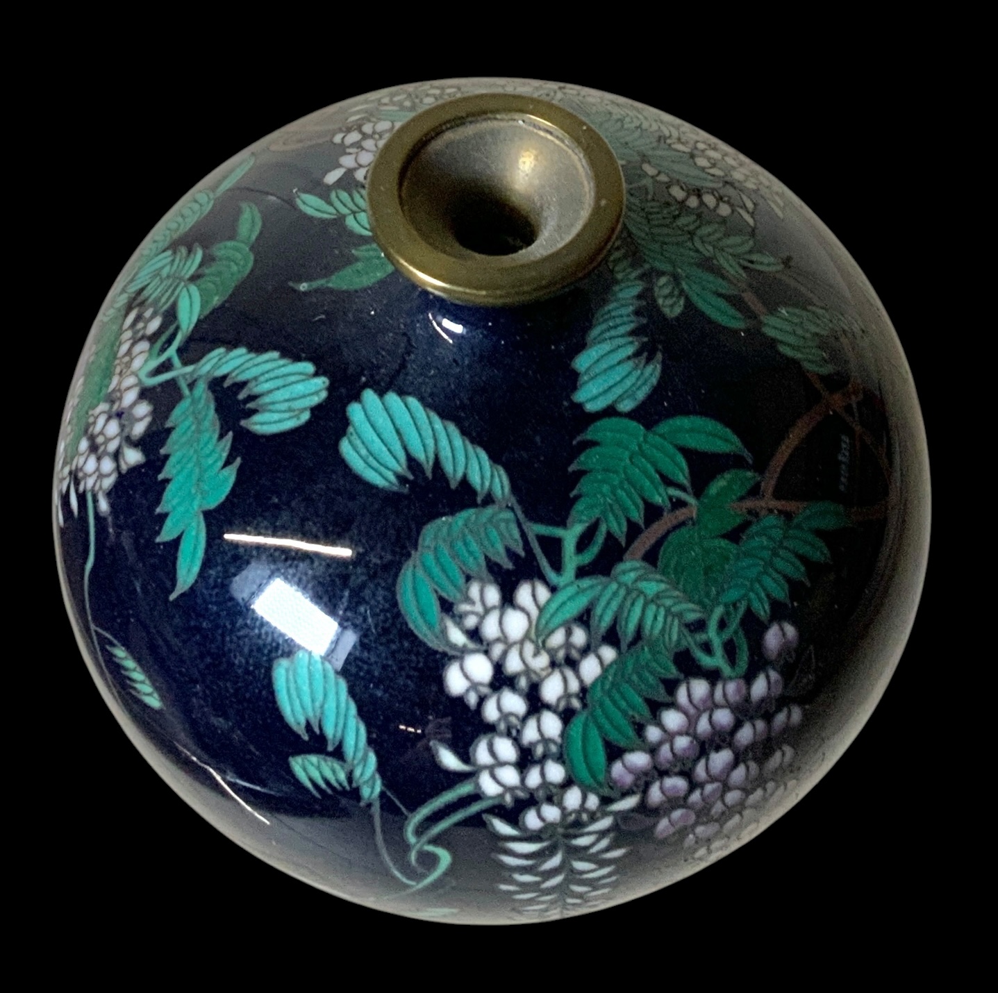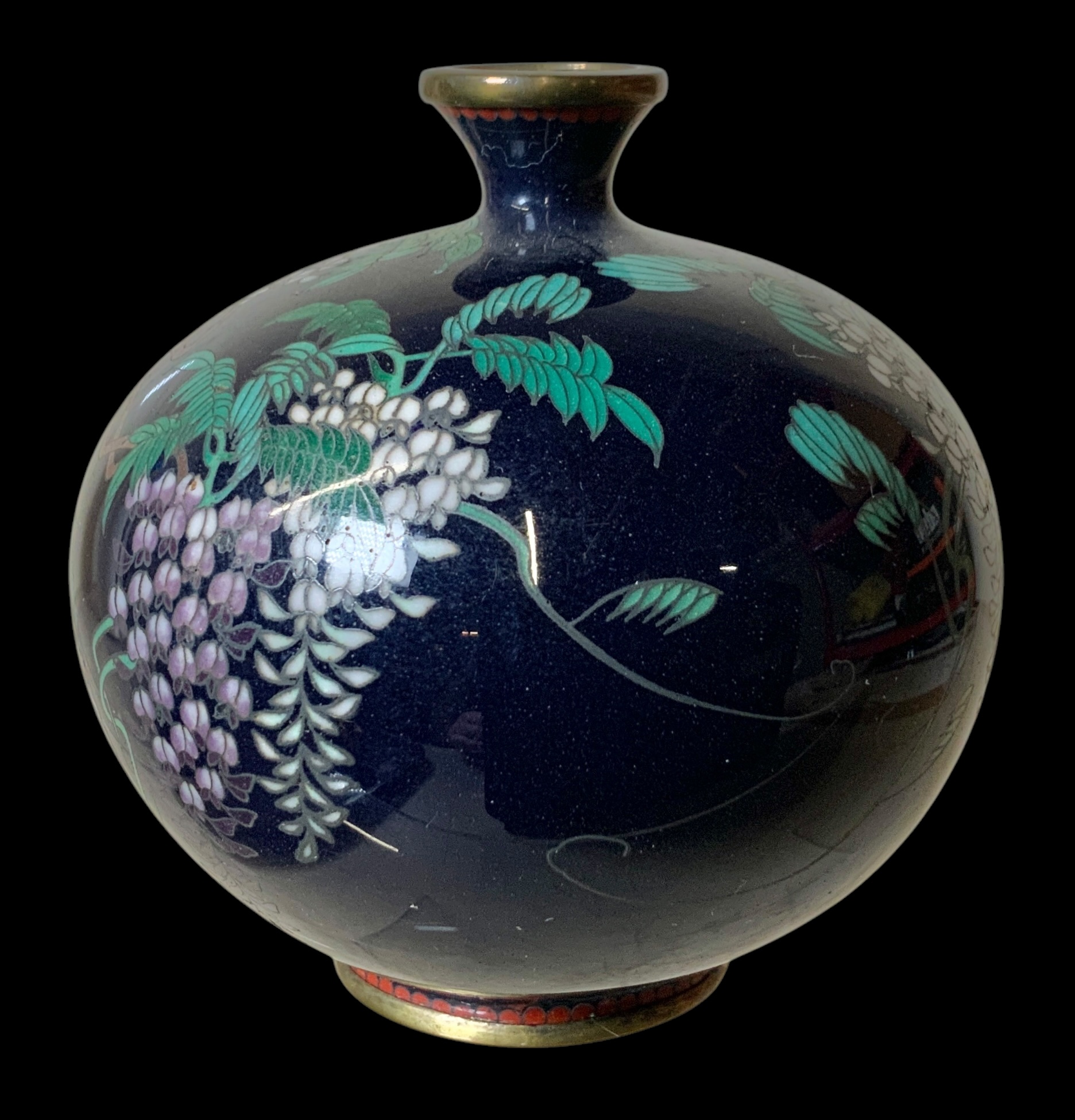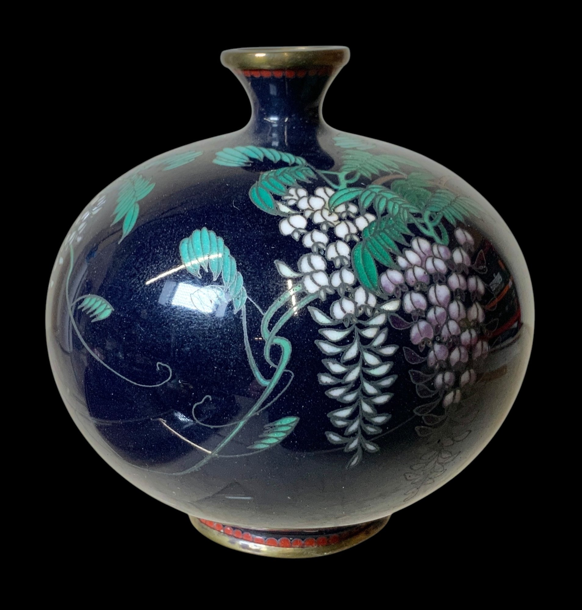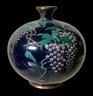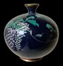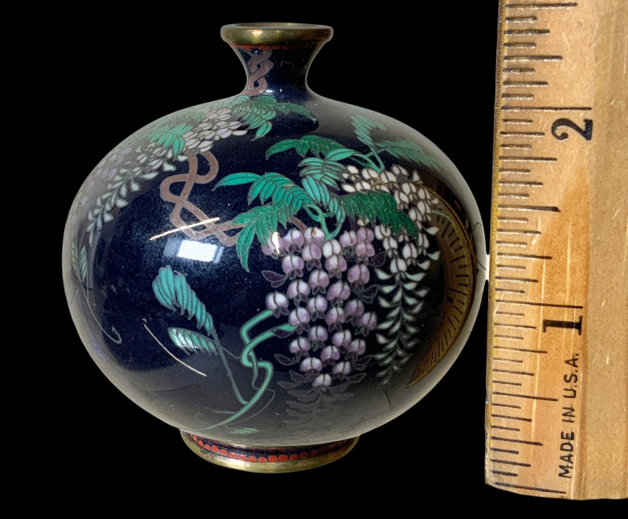 Japanese Miniature Cloisonne Enamel Wisteria Rounded Vase. Miniature vase features cloisonne enamel light purple and white wisteria with vines against a deep blue background. No visible chips or cracks, excellent appearance. Measures approximately 2.5” tall.