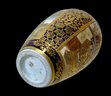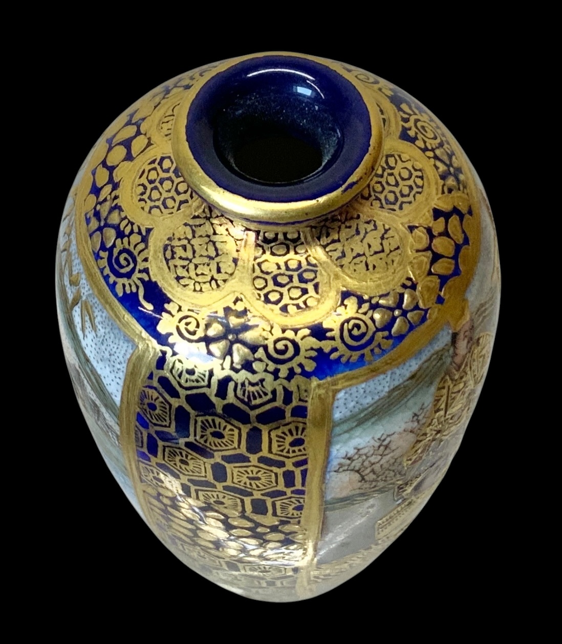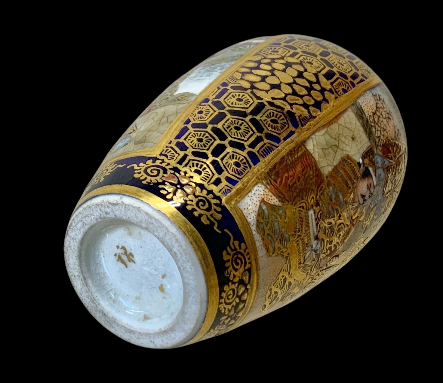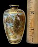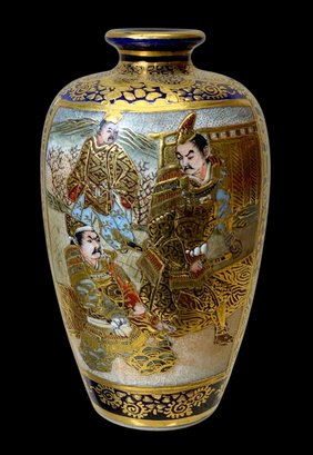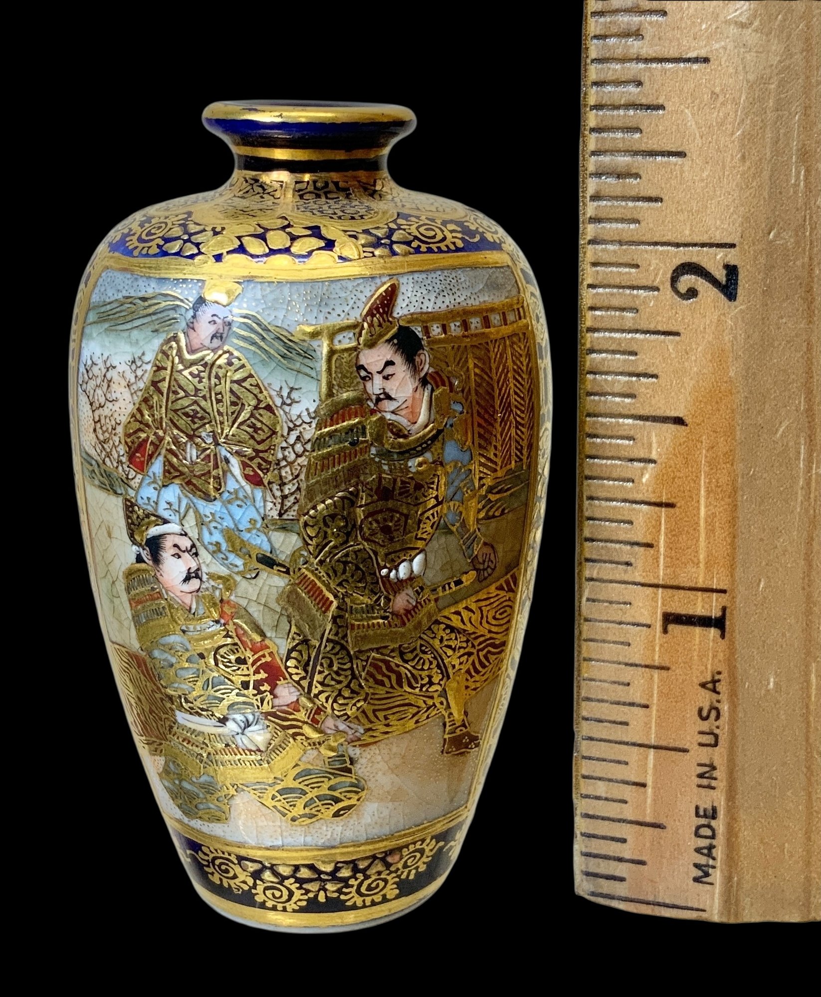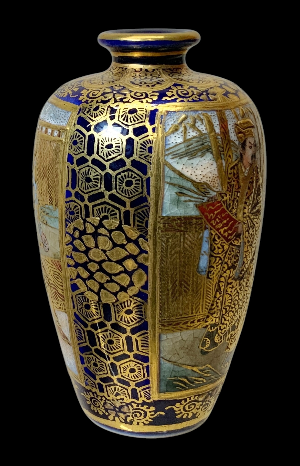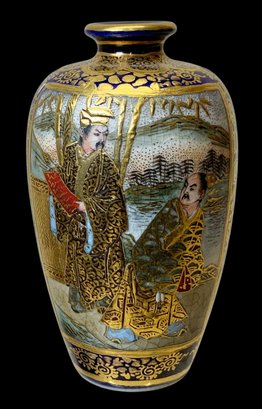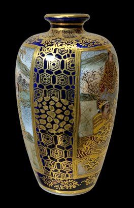 Japanese Miniature Satsuma Ware Gilt Enamel Vase. Gilt enamel panels depict male figures, possibly samurai, in fine intricate and colorful scenes. Vibrant cobalt blue base as background. Possible maker’s mark on bottom of base. No visible cracks or chips, excellent in appearance. Measures approximately 2.5” tall.