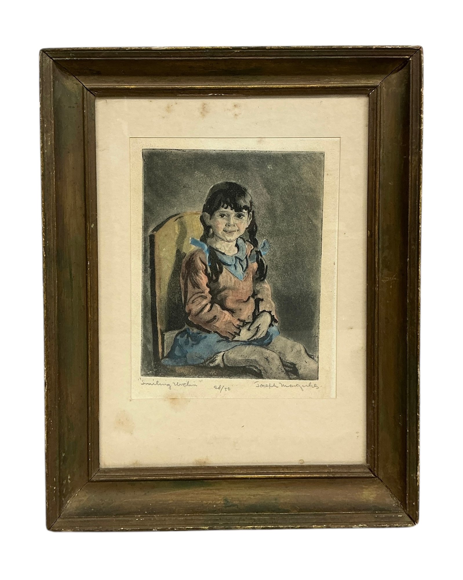 Joseph Margulies (1896-1984) Color Aquatint Titled Smiling Urchin Pencil Signed. In fair condition with some light age staining to the mat and aquatint. Sight size is approx. 8.25” by 6.25” and frame size is approx. 15” by 11.5.”