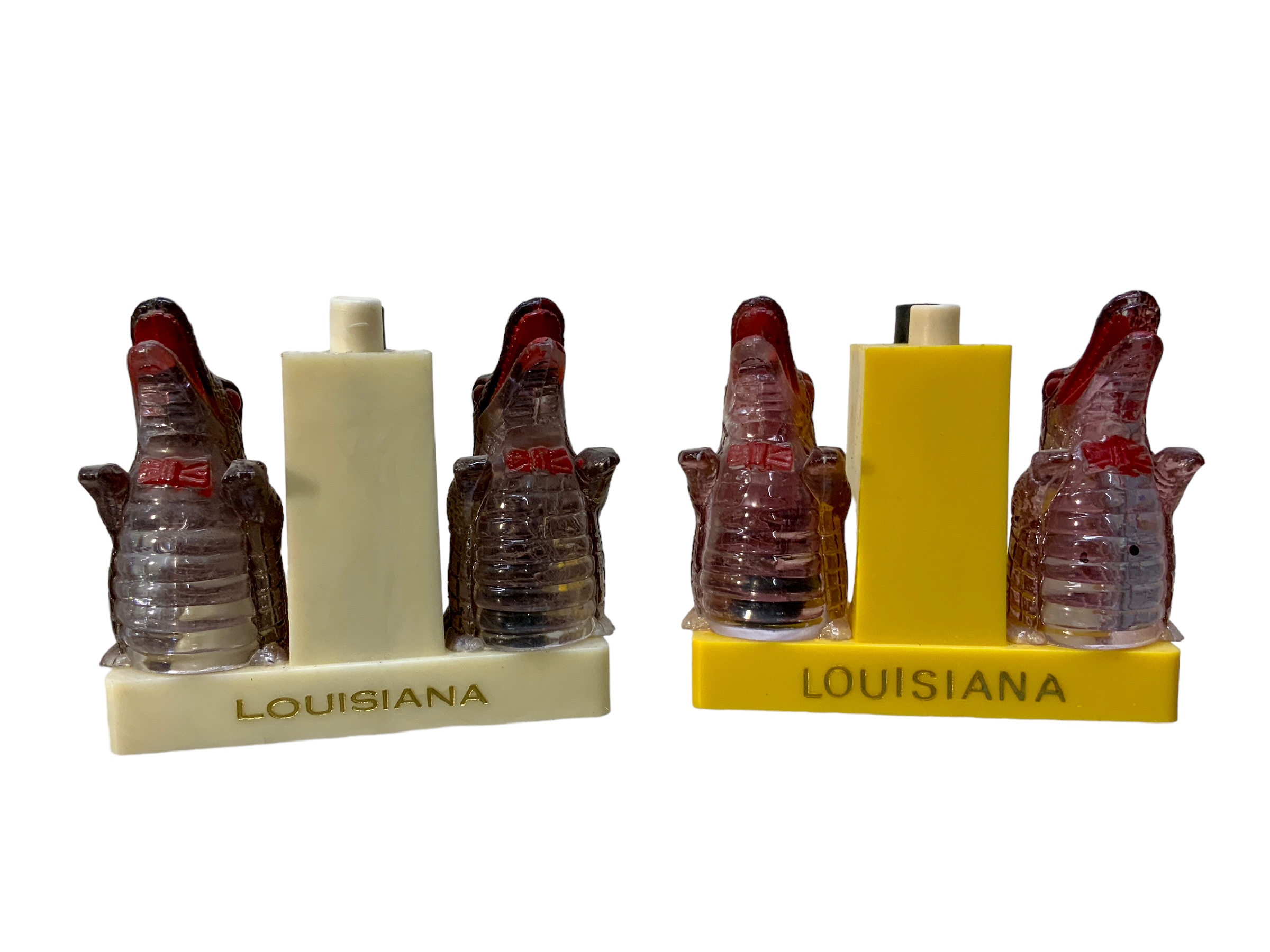 Kitschy Plastic/Celluloid Louisiana Alligator Salt And Pepper Shaker 2 Sets, each of these has a salt and a pepper.