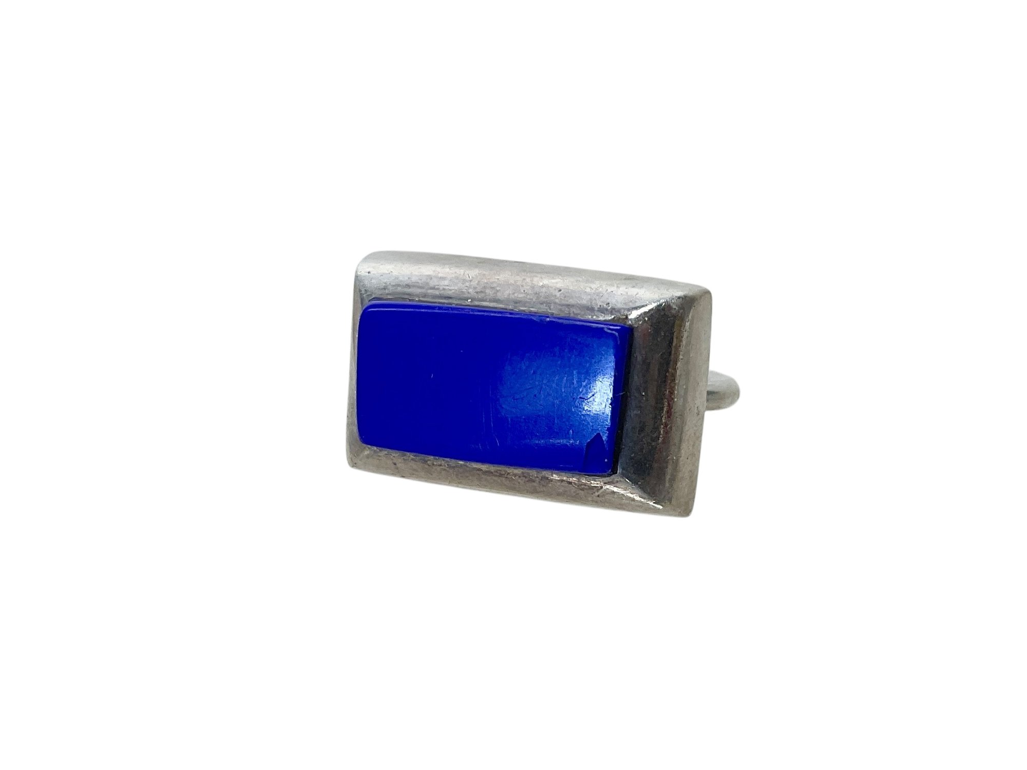 Lapis Statement Sterling Ring, has a small chip in the corner, see photos. Size 8. Weighs .24 ozt. No mark, but tested and guaranteed sterling.
