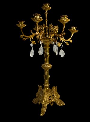 Large Antique Bronze Or Brass Candelabra Griffen Feet Hanging Teardrop Prisms. 22”x 12”.
