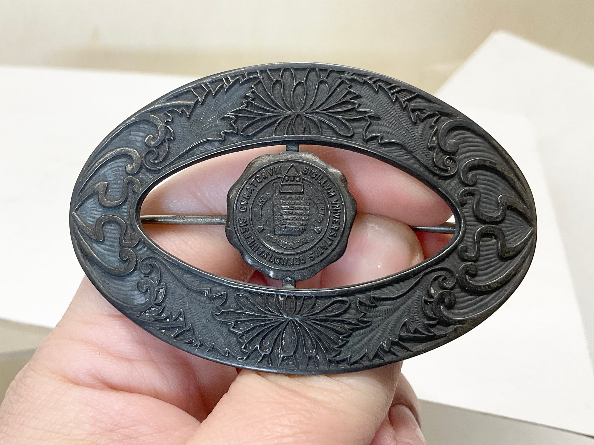 Large Antique Sterling Silver Collegiate Brooch Or Buckle, University of Pennsylvania. Measures 2.75” wide, the clasp on back is a bit loose. Weighs .955 ozt.