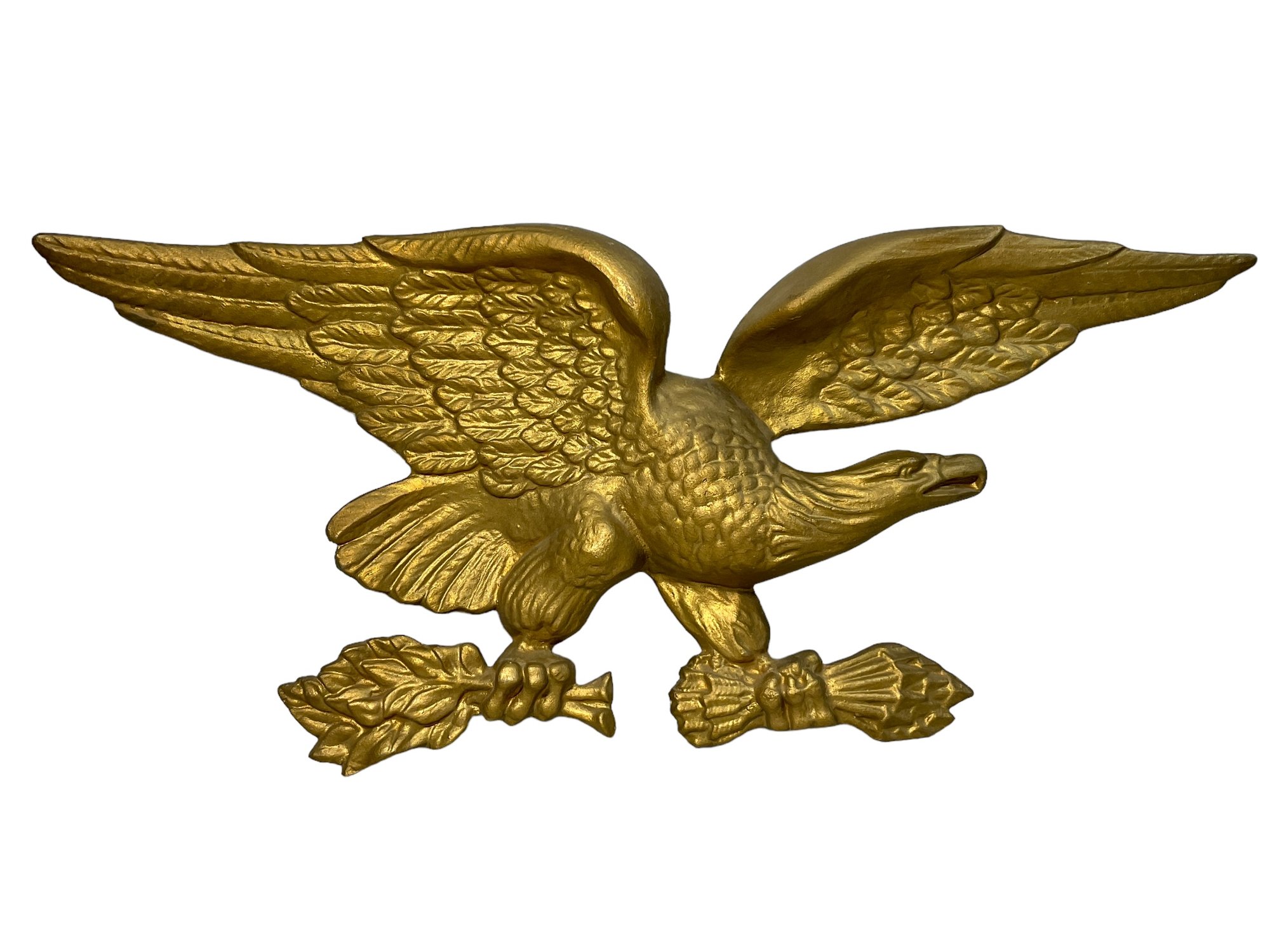 Large Cast Metal Eagle Painted Gold, vintage or antique, measures 24” wide.