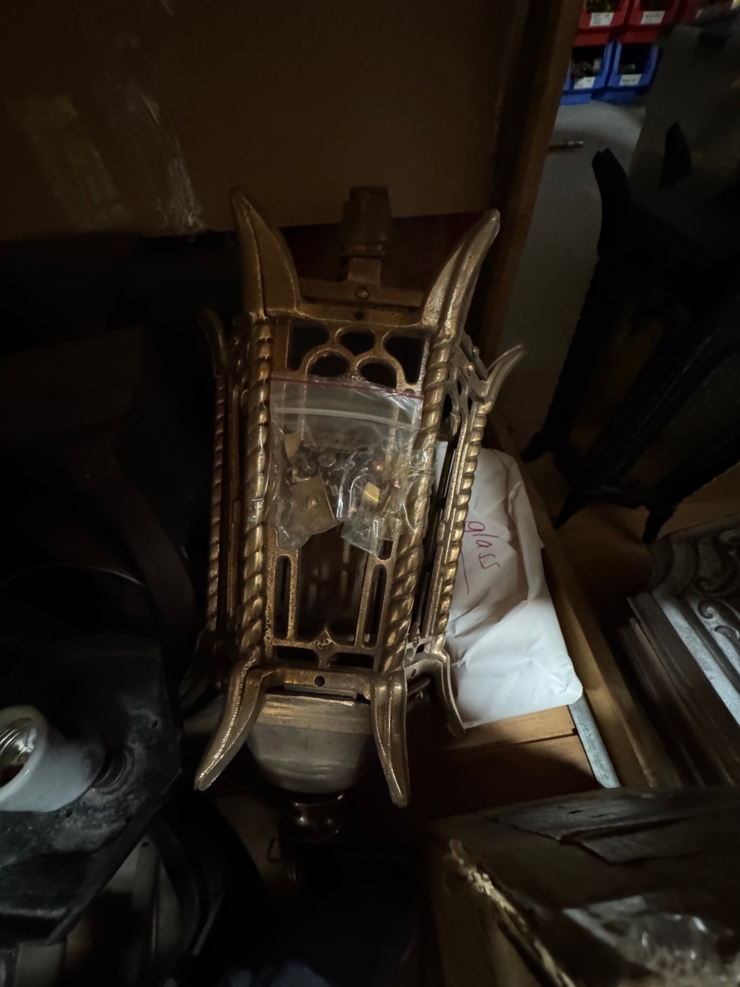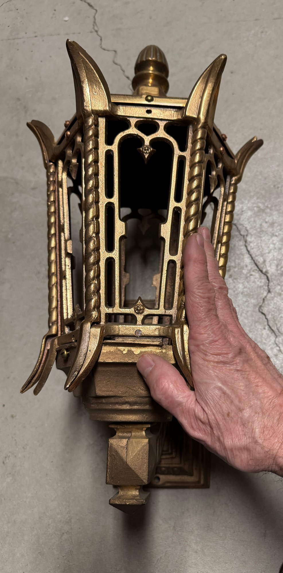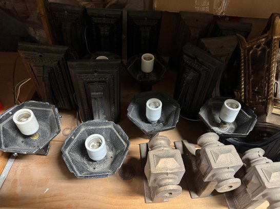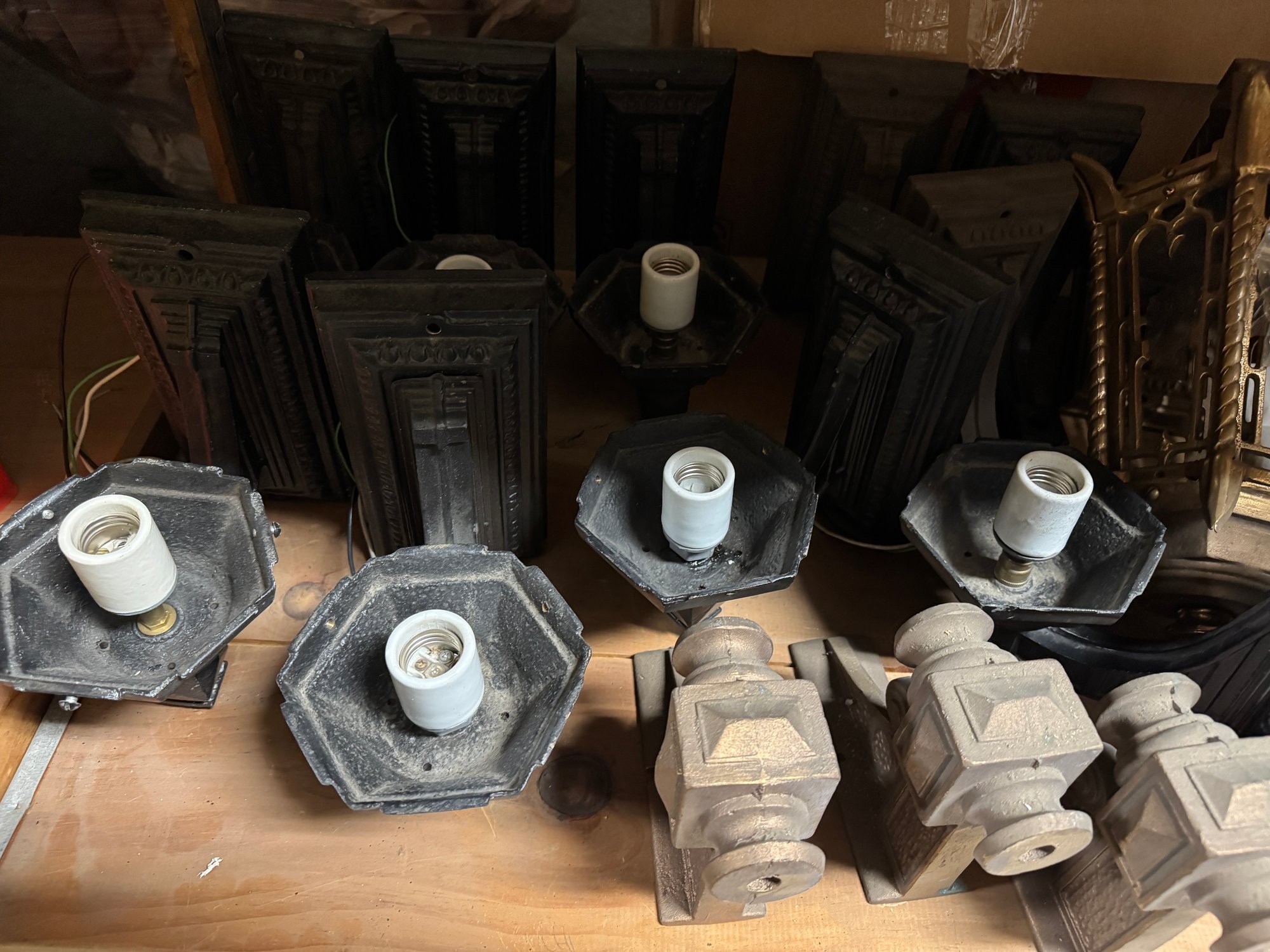 Large Lot of Huge Outdoor Cast Bronze & Iron Lanterns -and extra parts! We don't know exactly how many complete lanterns you can build with this lot. Here's what we DO know, all the bronze colored pieces are cast bronze, and the black ones are cast iron, and they're ALL fabulous! The largest pieces are 21" x 10"