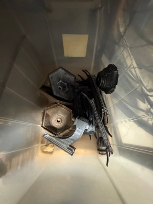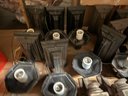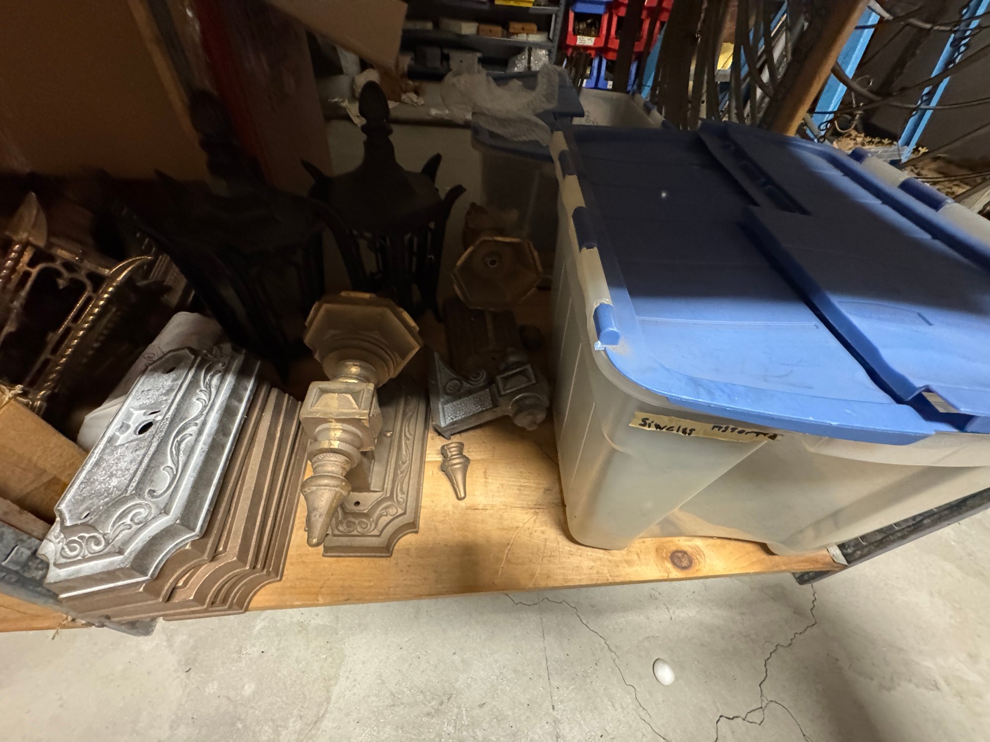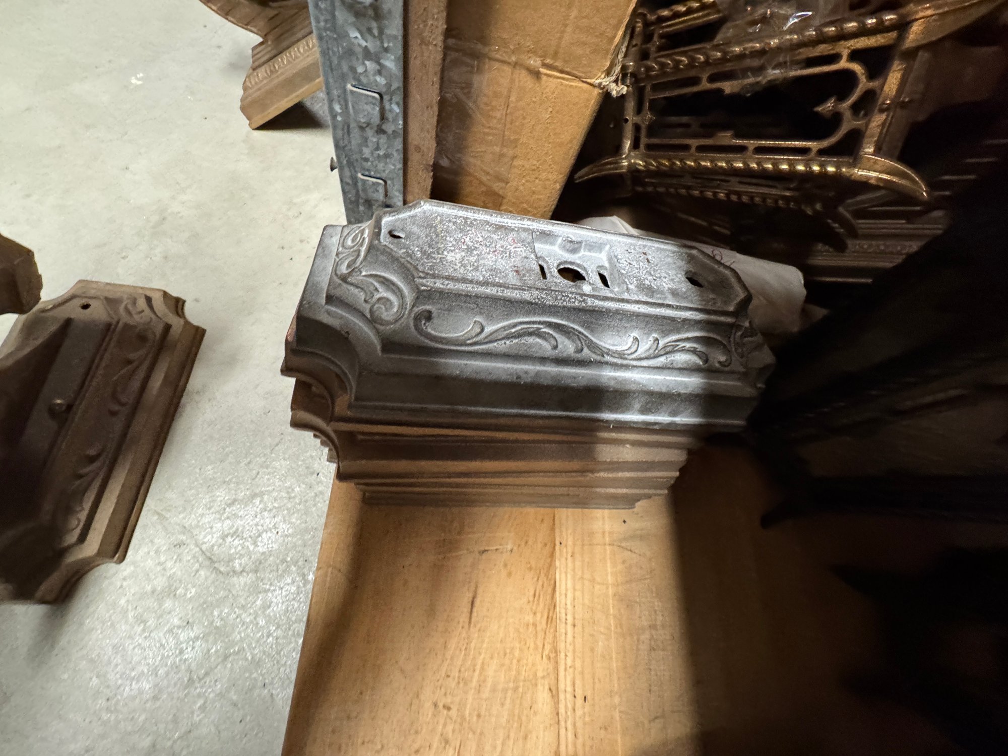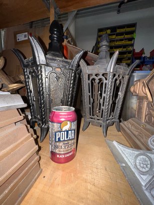 Large Lot of Huge Outdoor Cast Bronze & Iron Lanterns -and extra parts! We don't know exactly how many complete lanterns you can build with this lot. Here's what we DO know, all the bronze colored pieces are cast bronze, and the black ones are cast iron, and they're ALL fabulous! The largest pieces are 21" x 10"