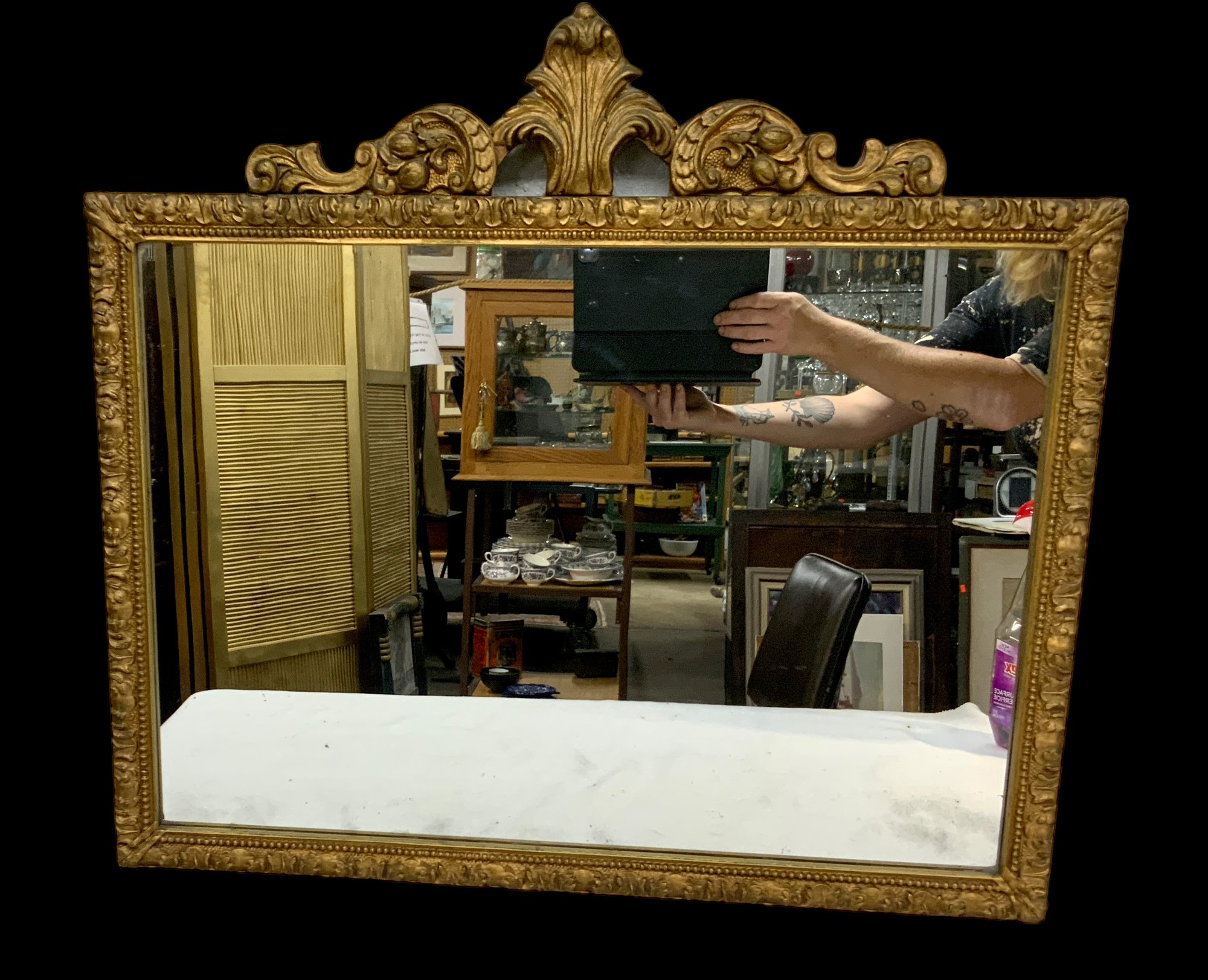 Ornate Antique Mirror, wood, plaster, gilt. 26 inches wide.