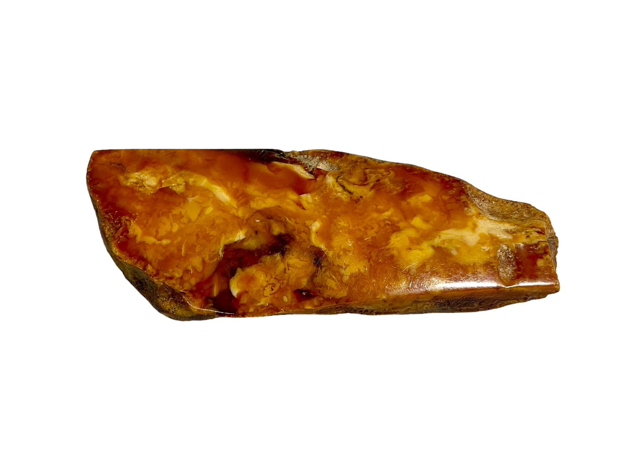 Large Piece of Polished Baltic Amber, 3 inches long. Weighs .62 ounces. Back shows a large wood inclusion?