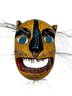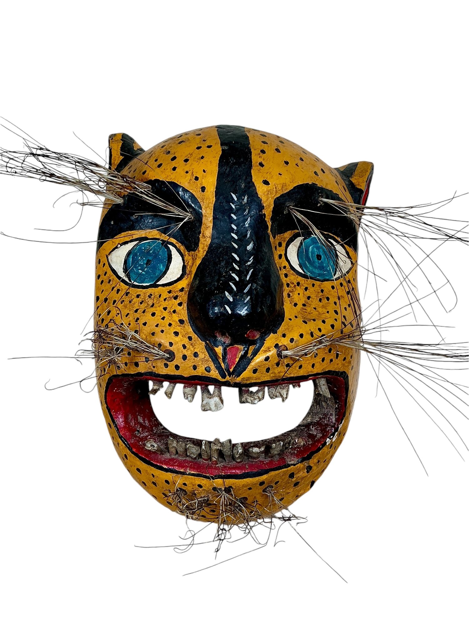 Large Primitive Painted Wooden Mexican Jaguar Mask With Real Teeth ?, measures 9.5” tall.