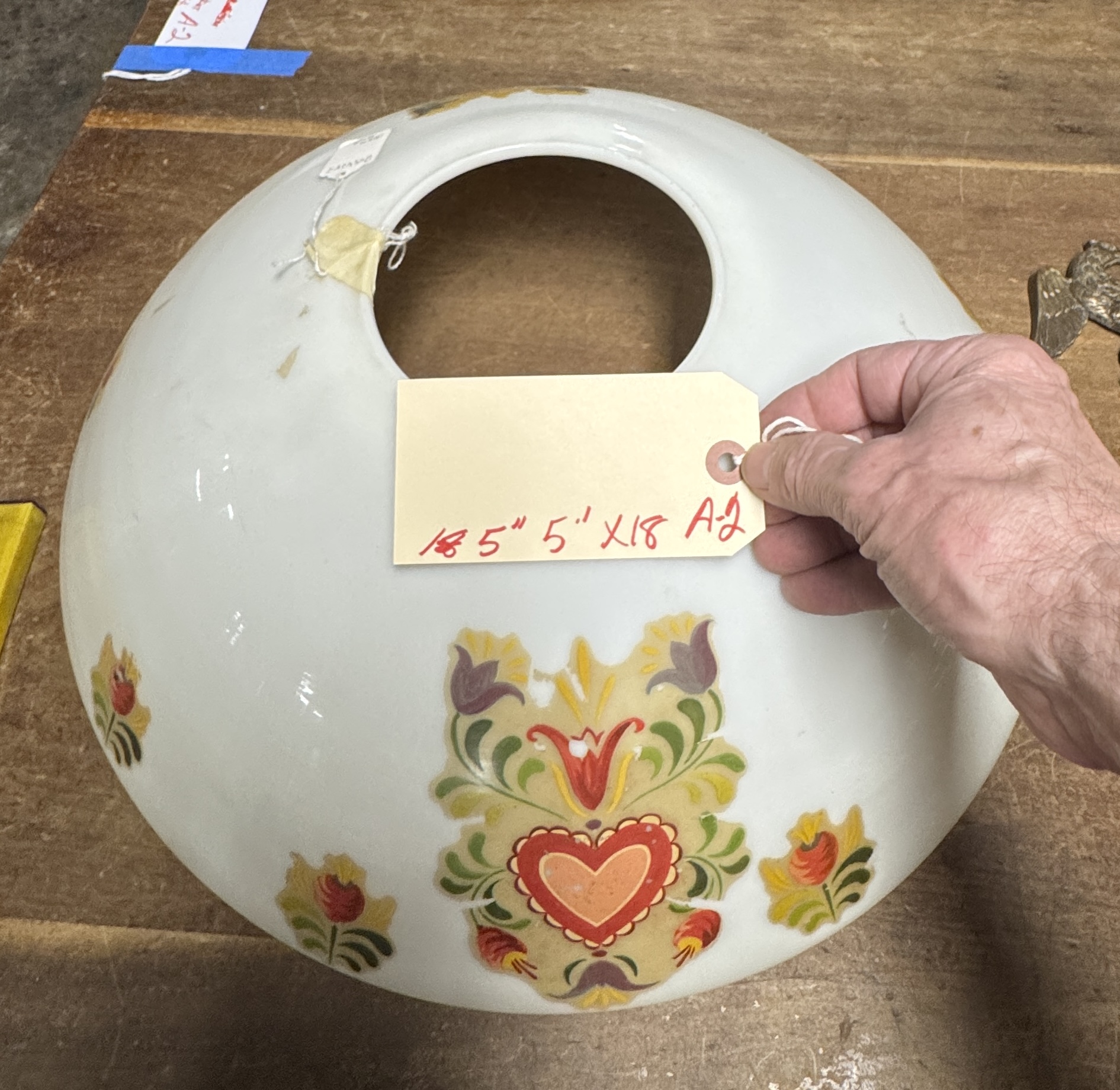 Large White Glass Shade w/ Penn Dutch style painting 5" h x 5" opening x 18" diameter.