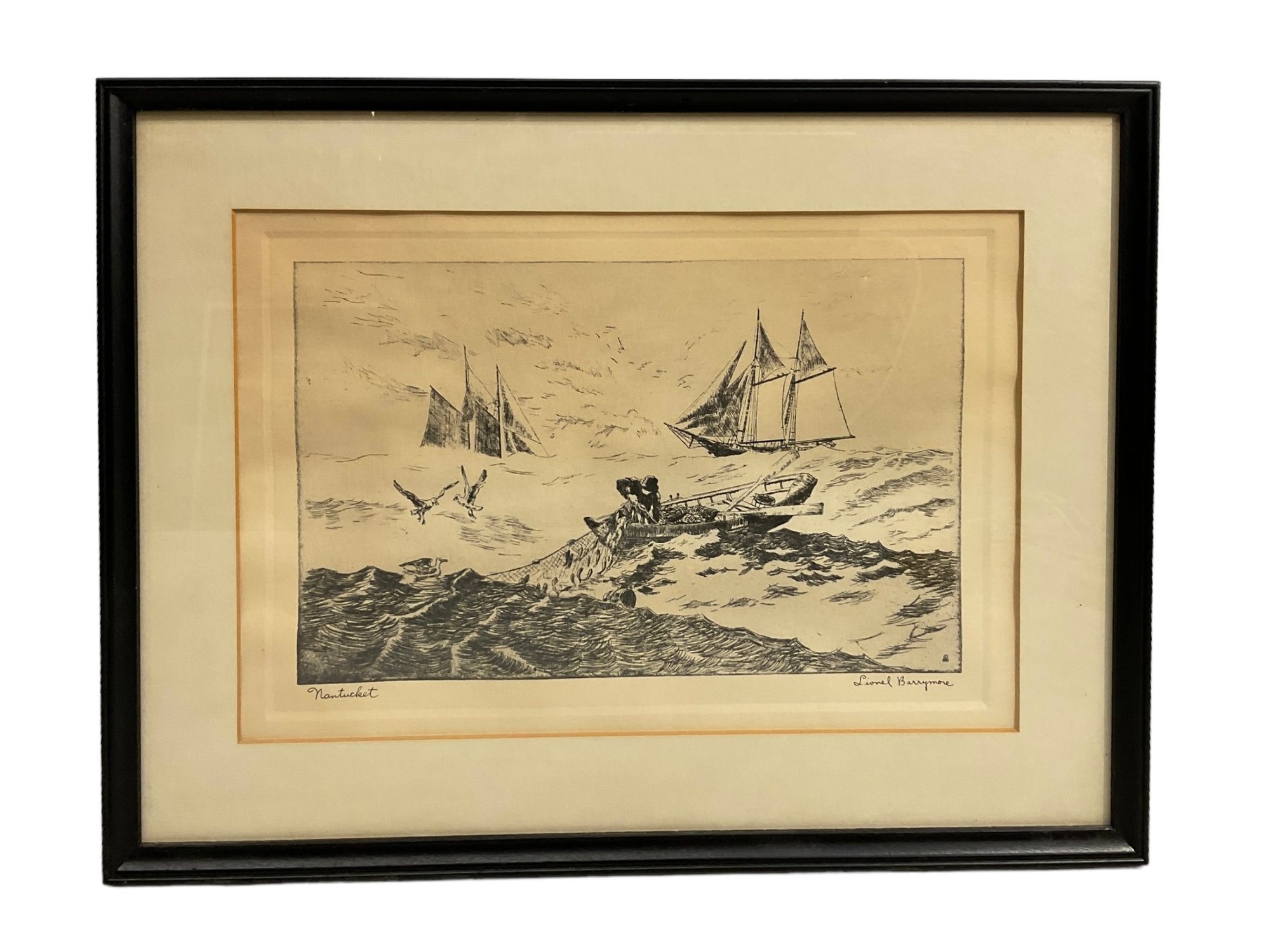 Lionel Barrymore Lithograph Print Fishermen Net Hauling Scene Titled Nantucket. In good condition. Sight size is 8.5” by 12.5”.