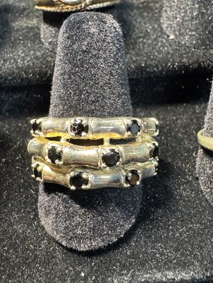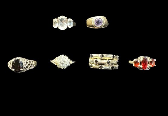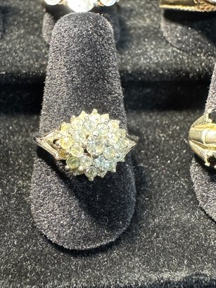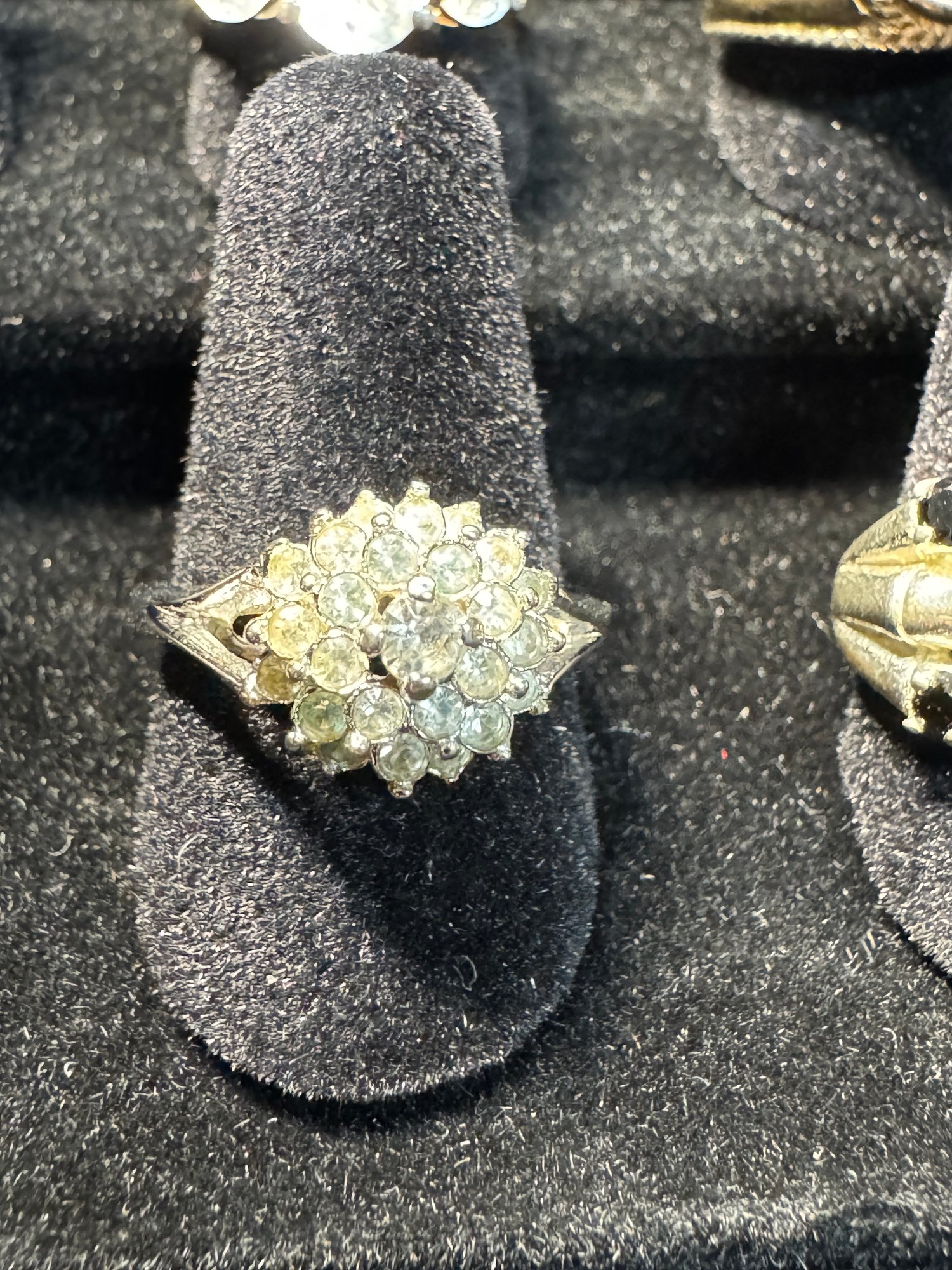 6 Marked sterling .925 silver rings. 5 are size 9 ish, the one with the cluster of many white stones is a size 8. These are beautiful and in very good condition. Heads up resellers!