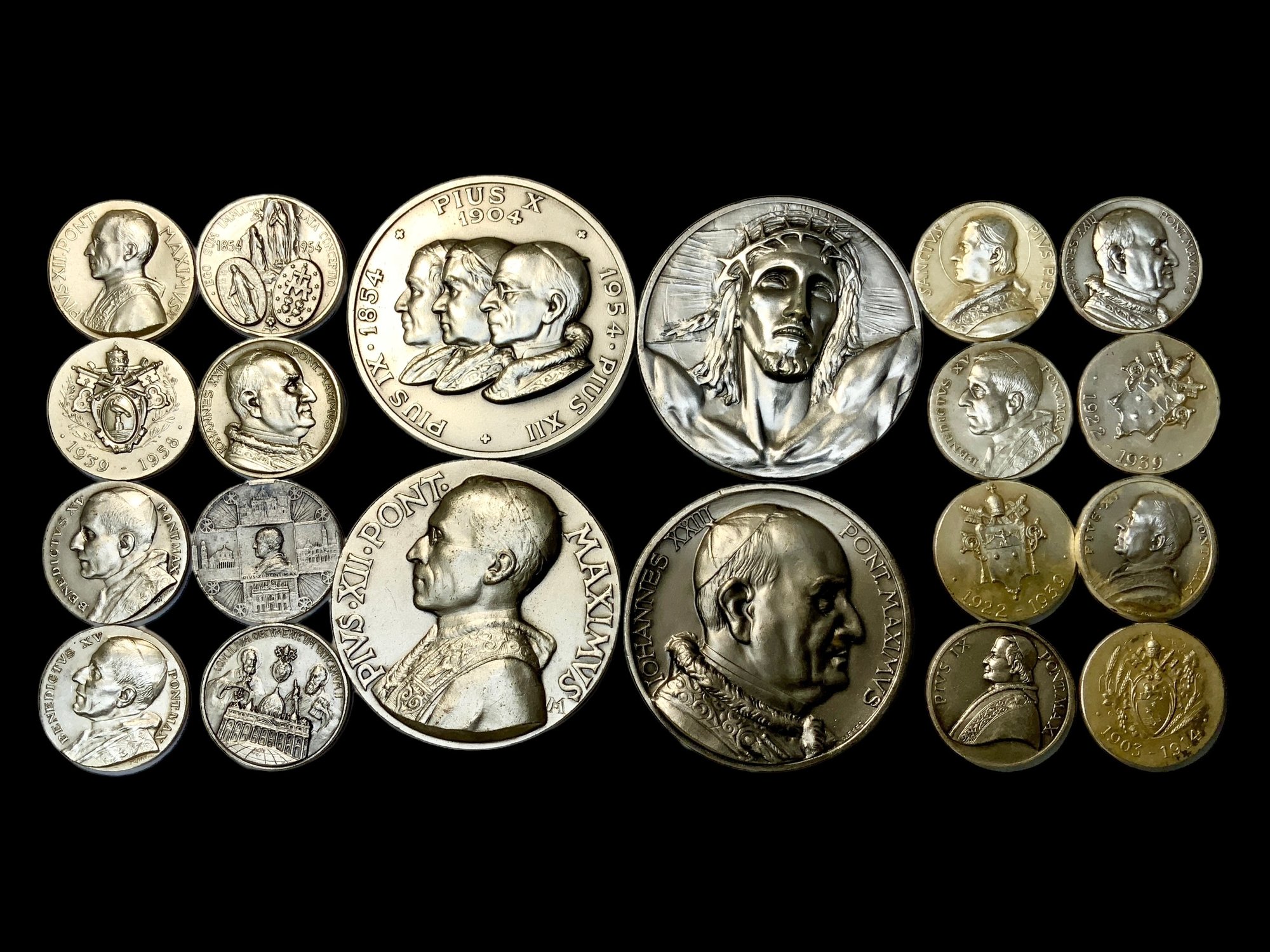 Lot Of 20 Vintage Pope Medallions, four large 2” diameter and 16 smaller 1” diameter tokens, various popes, see photos for years and popes represented.