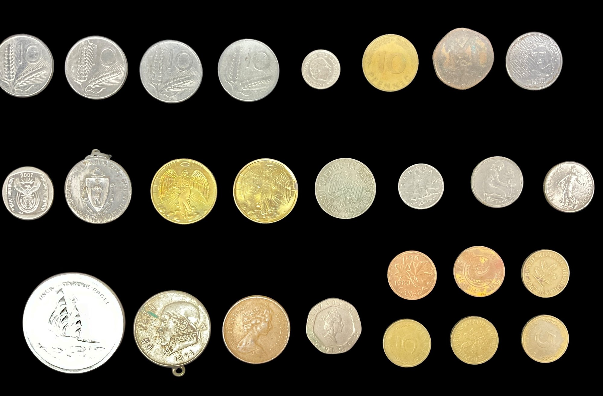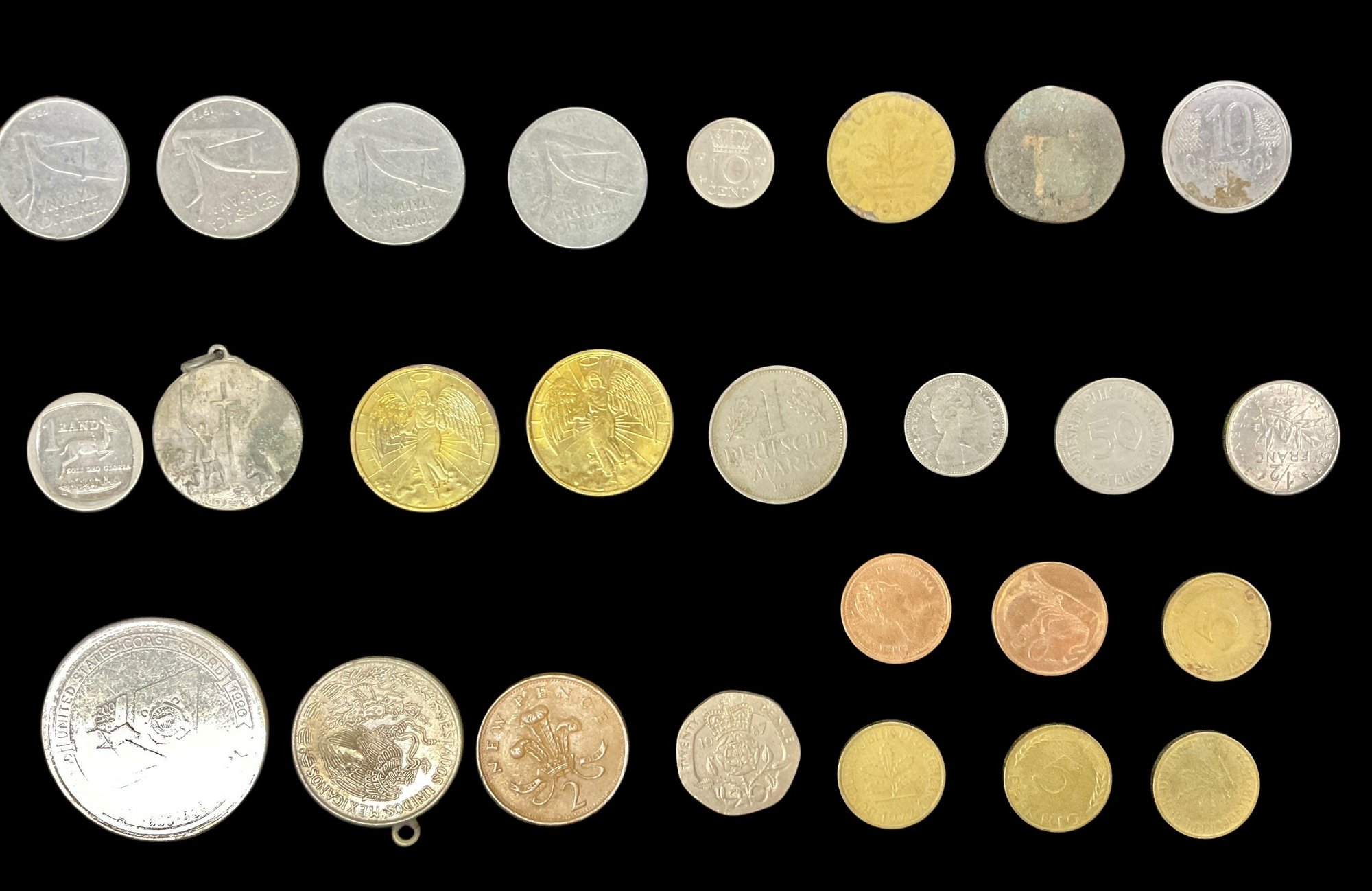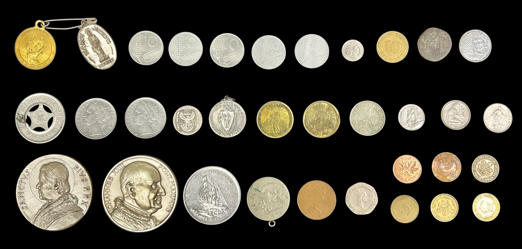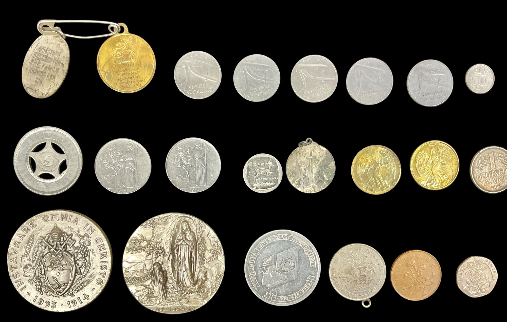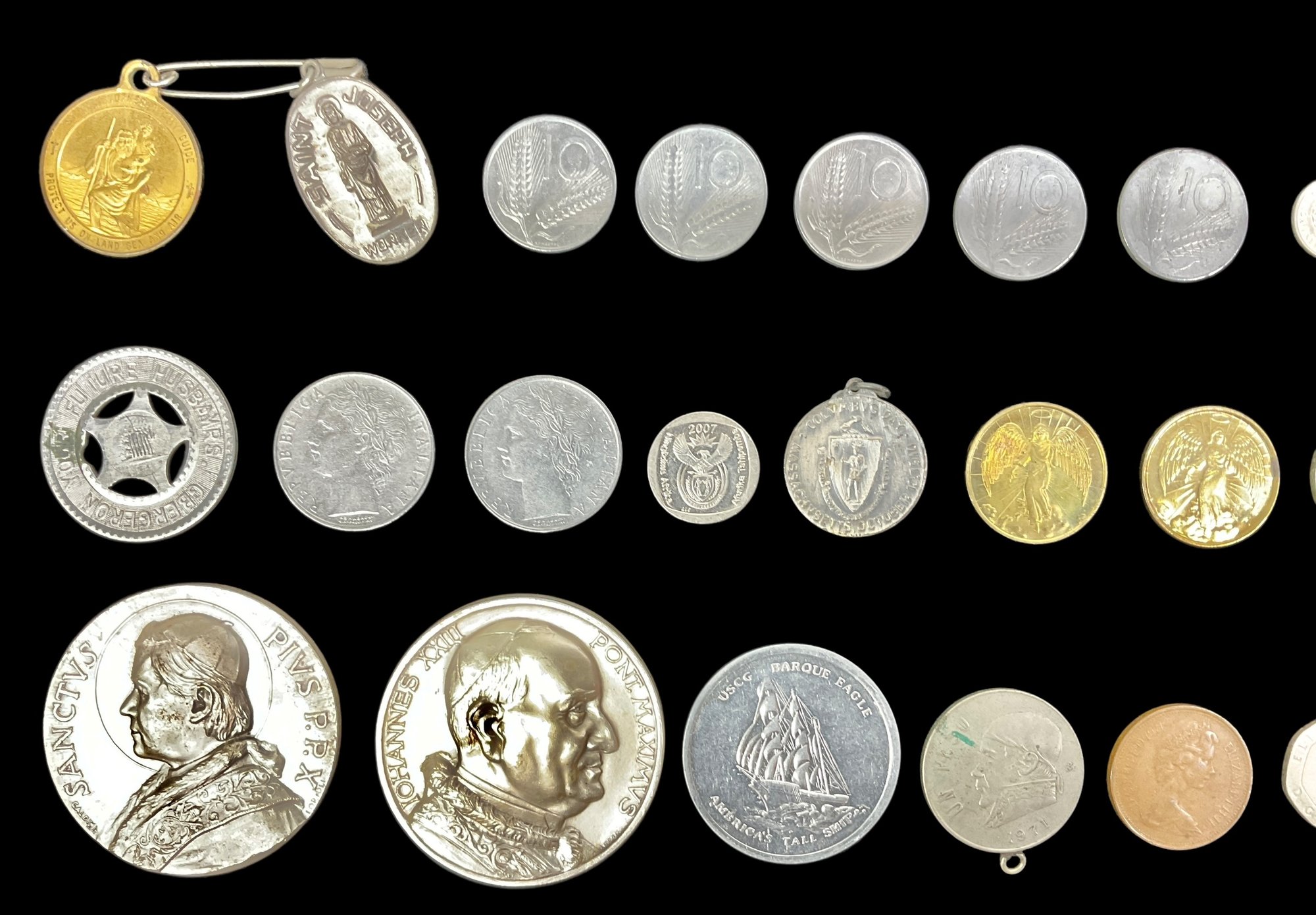 Lot Of 34 Assorted Coins Medals And Tokens. Includes religious tokens, commemorative tokens and vintage/antique coins. Largest token has a diameter of approximately 2”. Please view photos for more details.