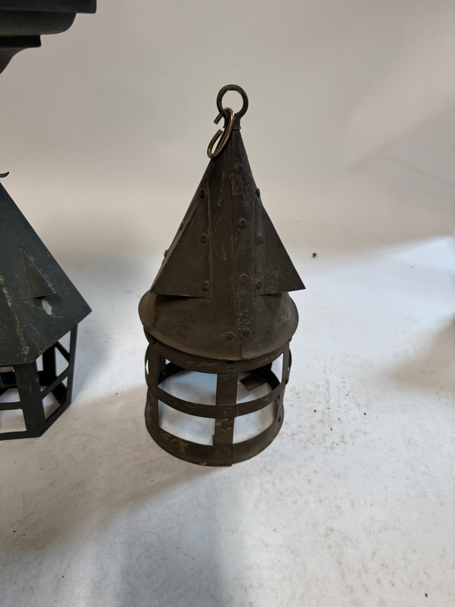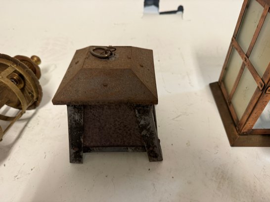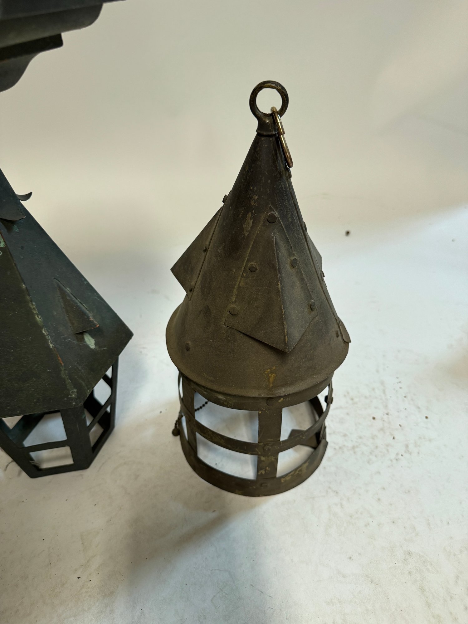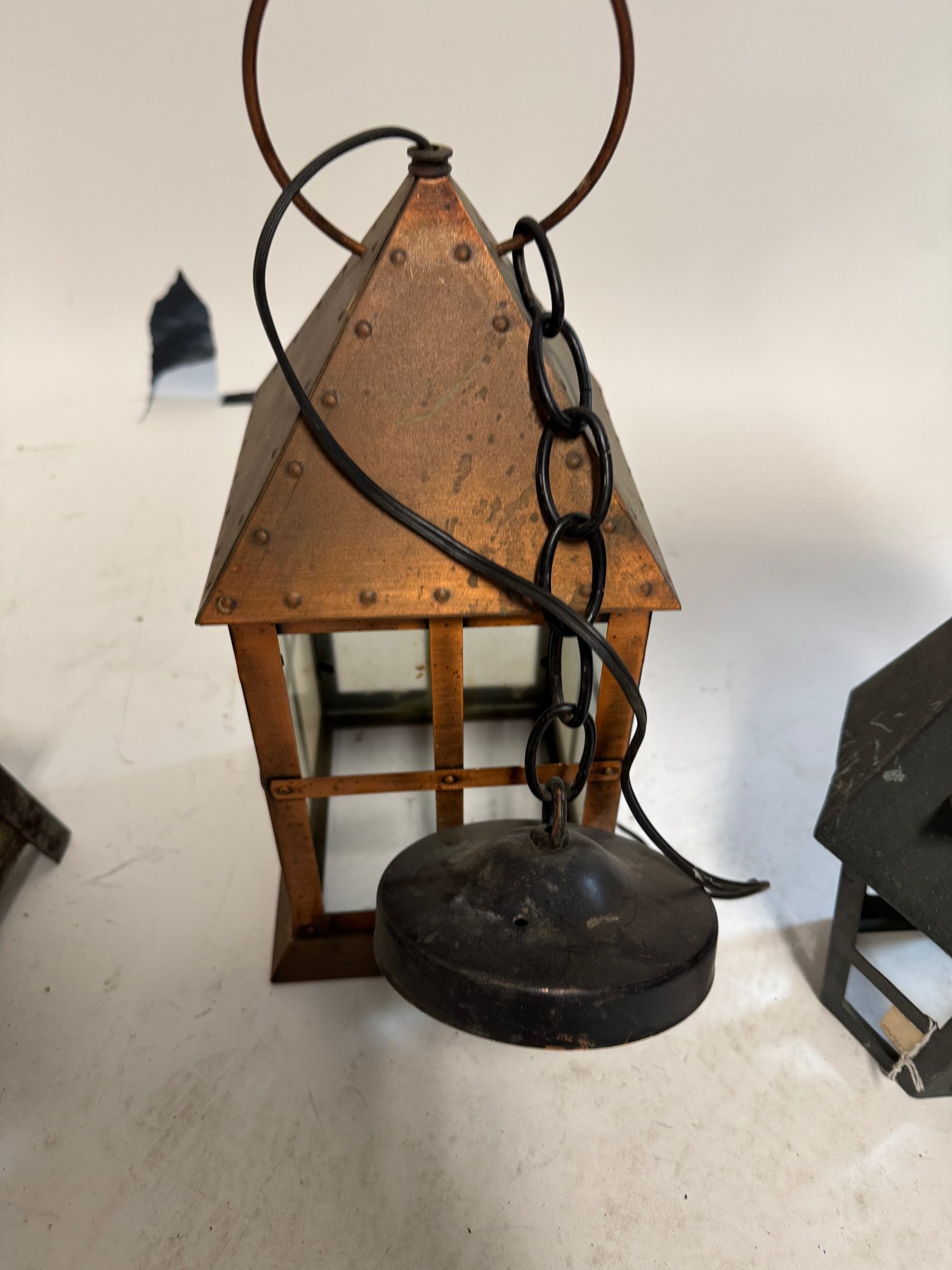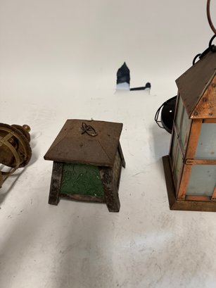 lot of 5 antique/Vintage Lanterns, Stained Glass etc. The little stained glass one has all of it's panels. We LOVE these, they're not perfect, but they're so much fun! The largest is 16" x 11"