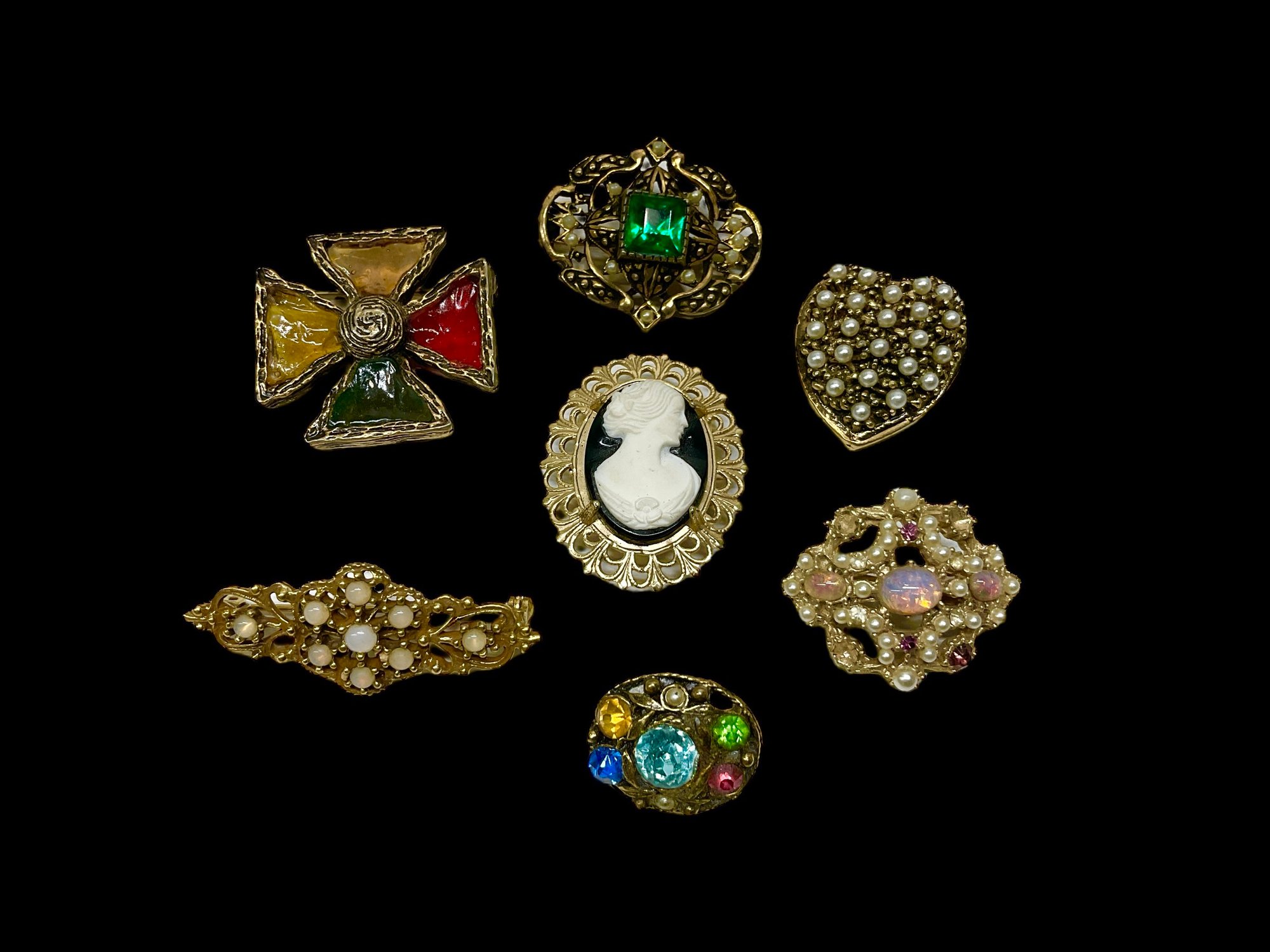 Lot Of 7 Vintage Or Antique Rhinestone Pins, largest measures 2” wide. Some may be missing a rhinestone or two, see photos for condition.