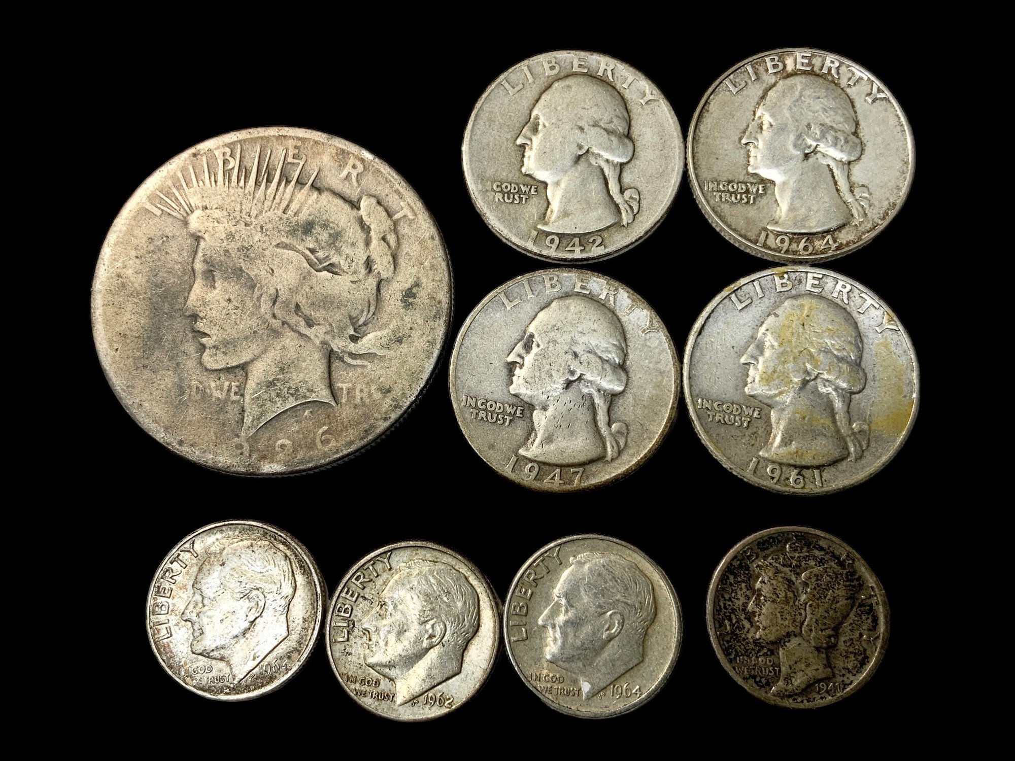 Lot Of American Coins All 90 Percent Silver, 1926 Peace Dollar, 4 Washington Quarters, one 1941 Mercury Dime and three Roosevelt Dimes. See photos for condition.