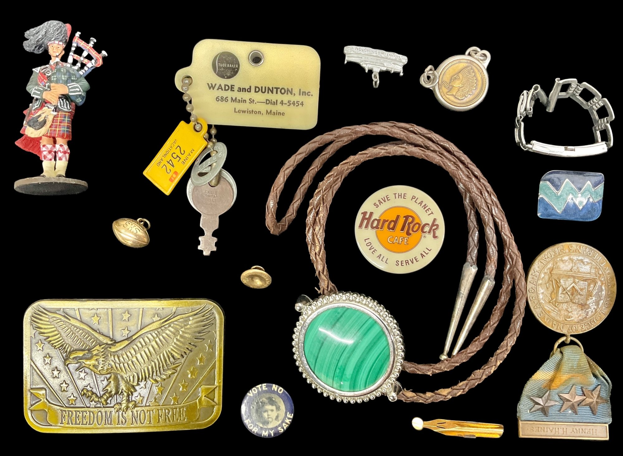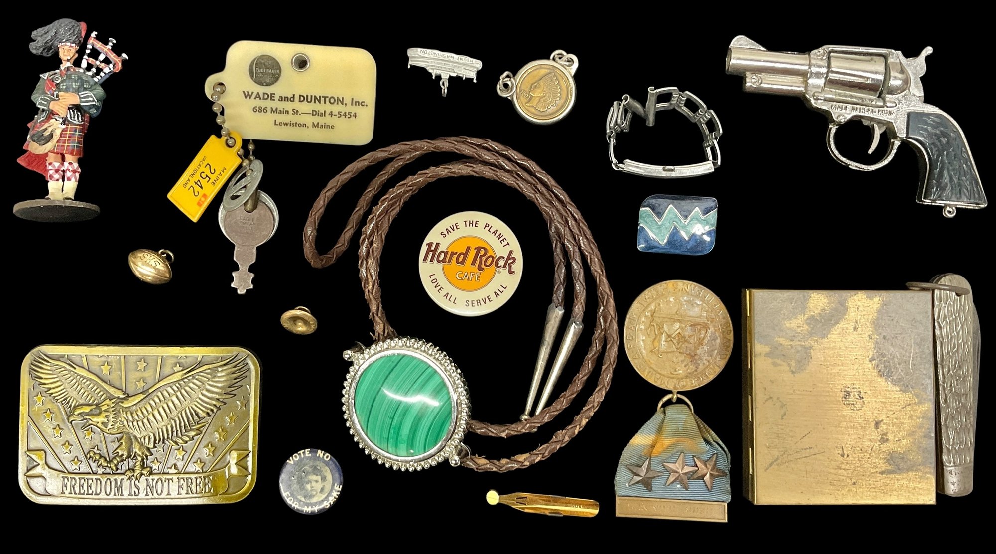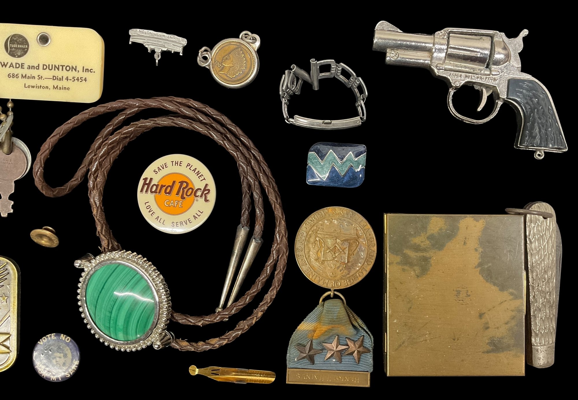 Lot Of Assorted Small Vintage Items Including Pins And Bolo Tie. Lot includes a malachite bolo tie, a belt buckle, a toy gun, a medal and other assorted small items. Please view photos for more details.