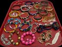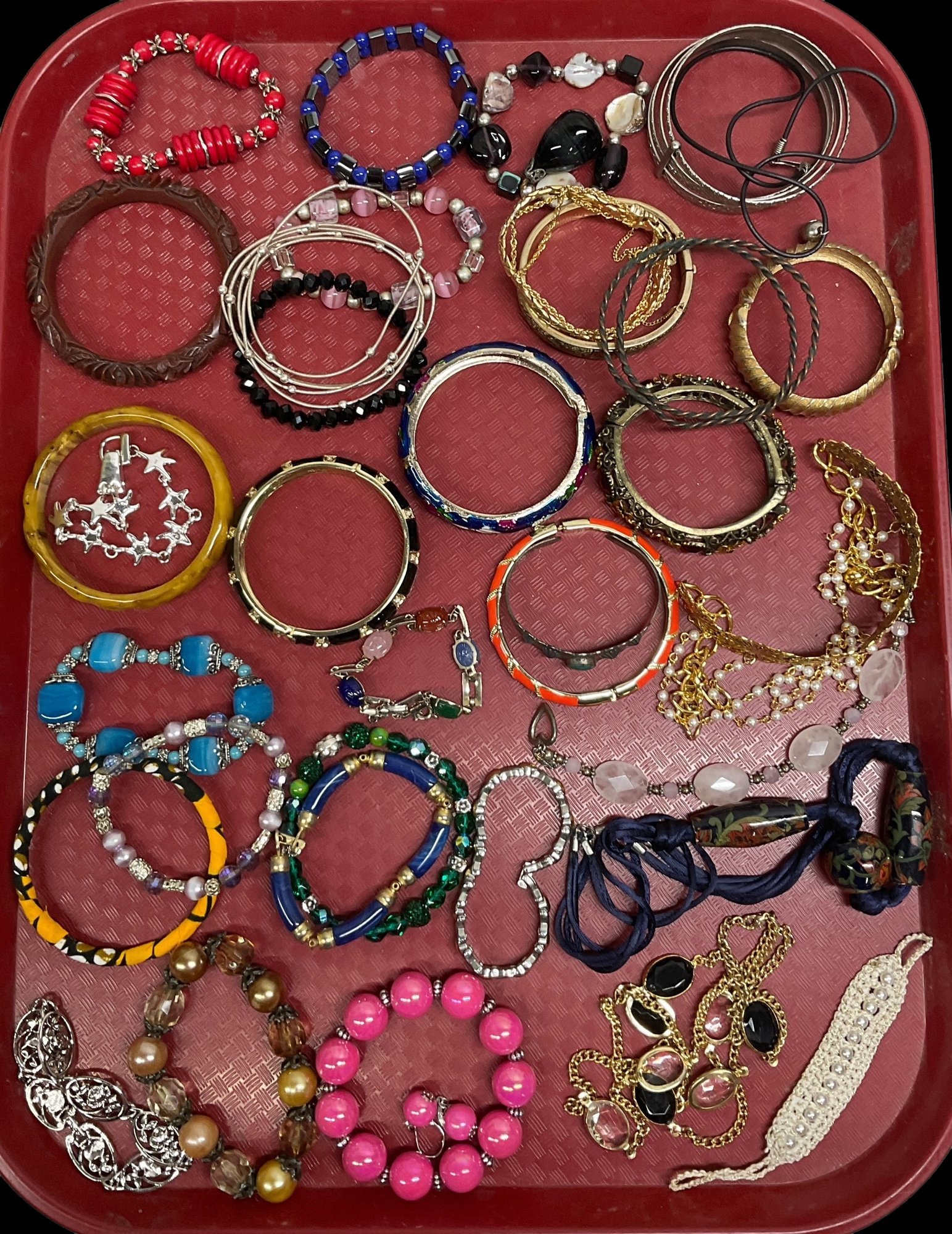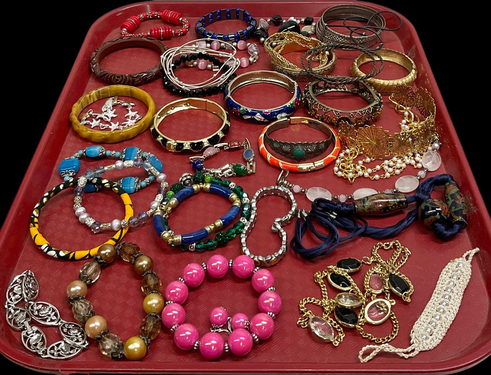 Lot Of Assorted Vintage Bracelets, Bangles And Necklaces. Includes a vintage glass scarab bracelet, a vintage carved bangle, a cloisonné enamel bracelet, a turquoise cuff bracelet and many more types of bracelets. Also includes a few necklaces. Please see photos for details.