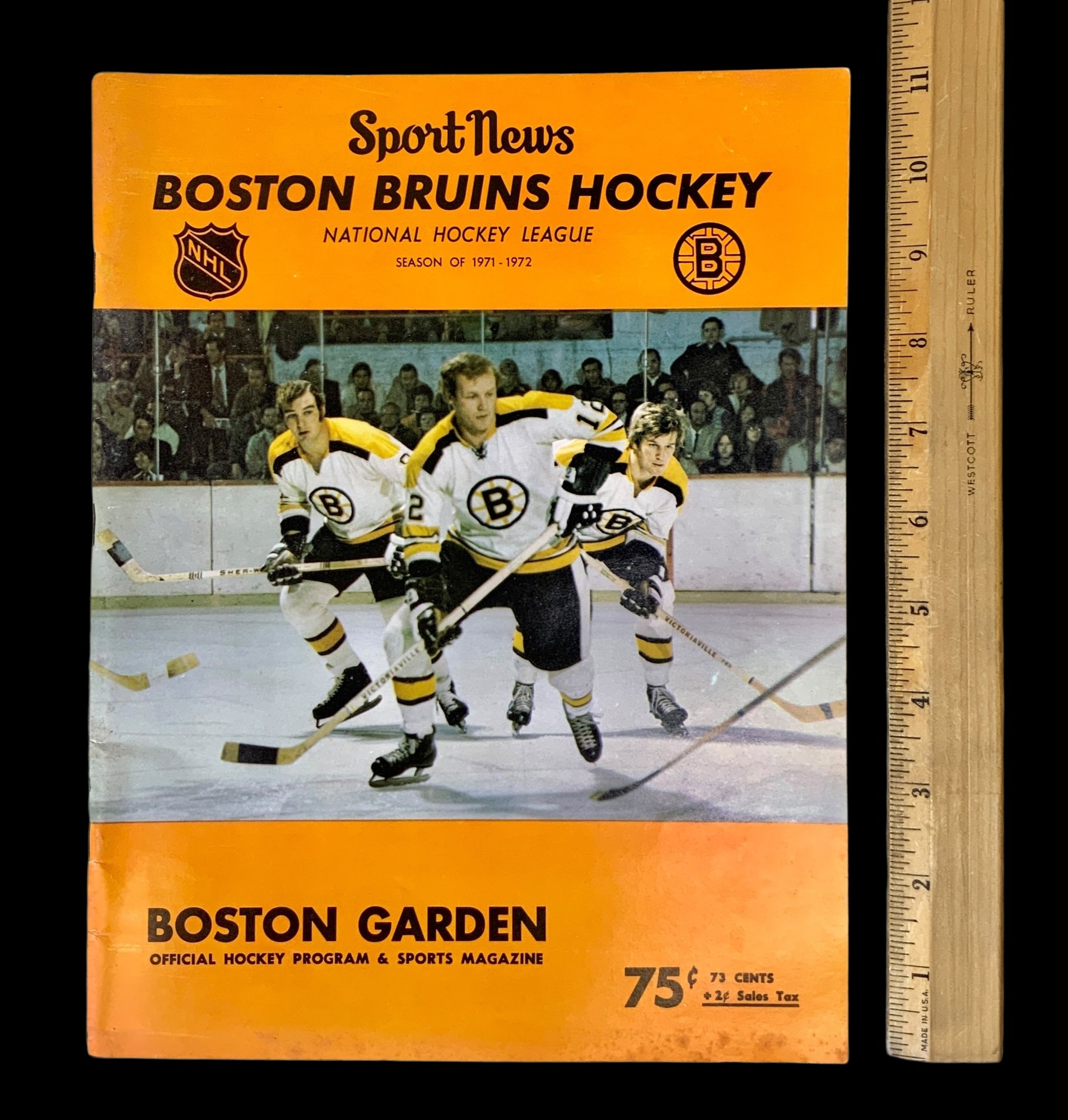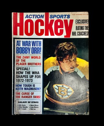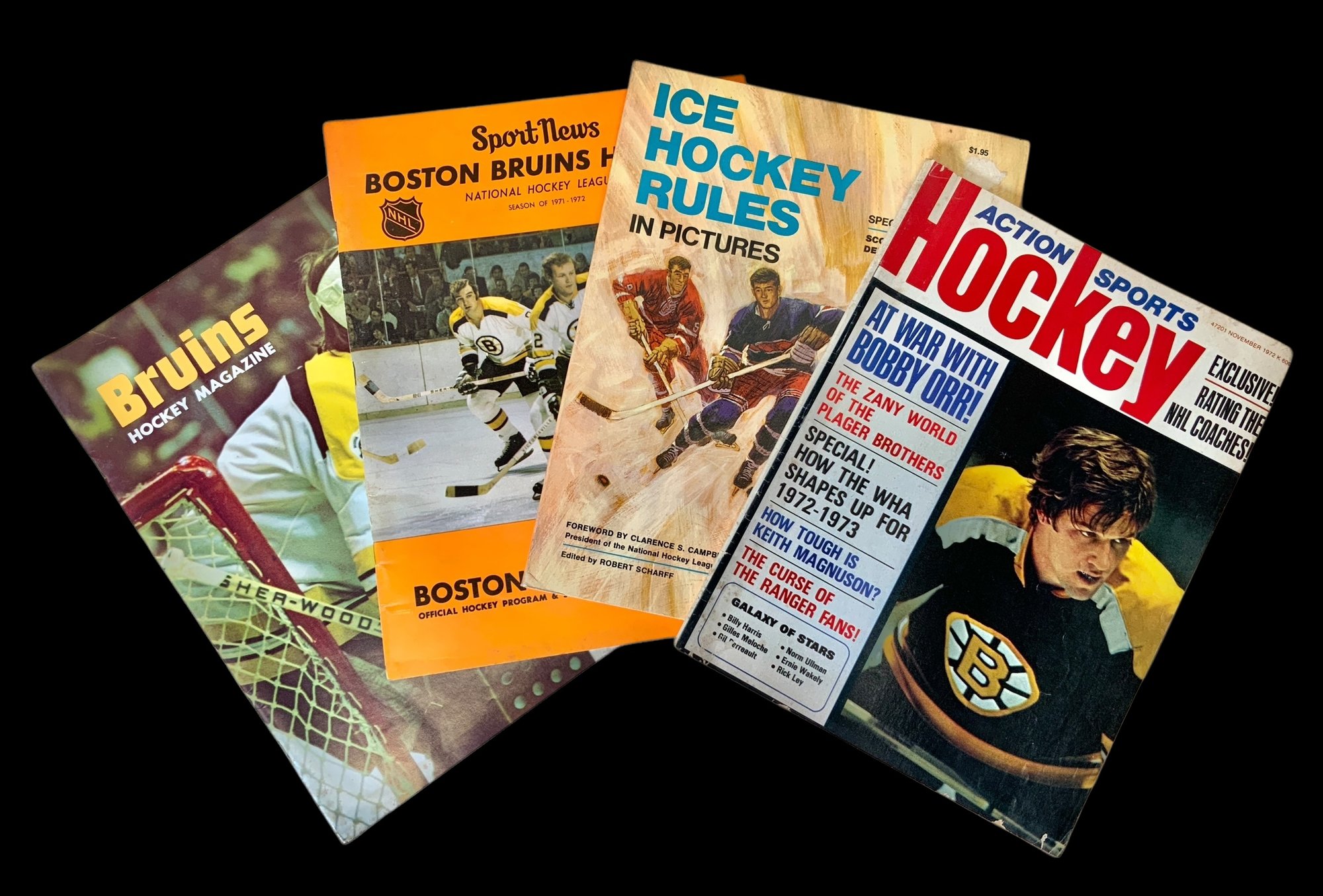 Lot Of Four Vintage Hockey Magazines 1960s-1970s. Bruins Hockey Magazine from 1974, Action Sports Hockey magazine from 1972, Ice Hockey Rules in Pictures from 1967 and SportNews Boston Bruins Hockey Season of 1971-1972. All magazines show general wear from age. Please see photos for more details. Largest magazine measures approximately 11” long.