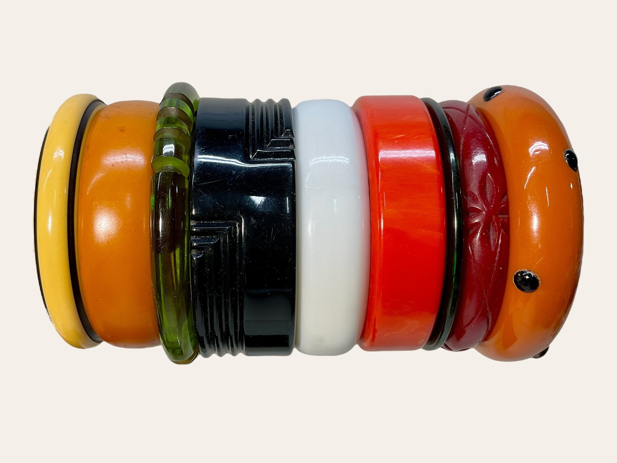 Lot Of Nine Vintage Or Antique Bangle Bracelets Early Plastic Or Bakelite, these are not tested. Vary in width. See that the polka dot bangle is missing two dots.
