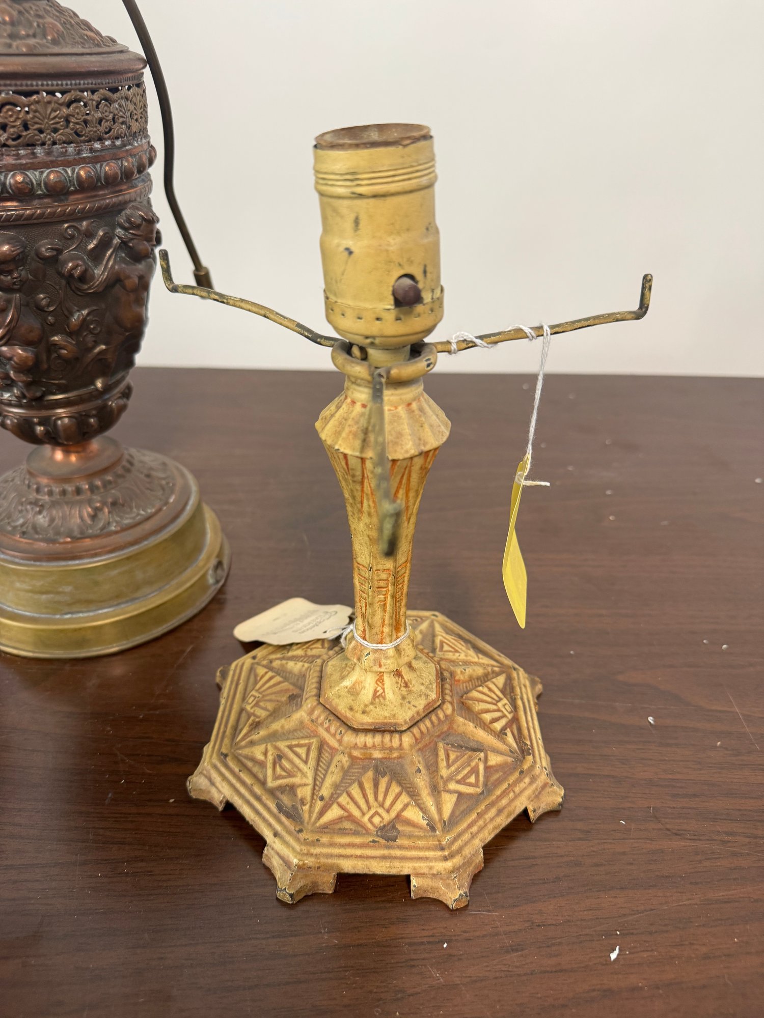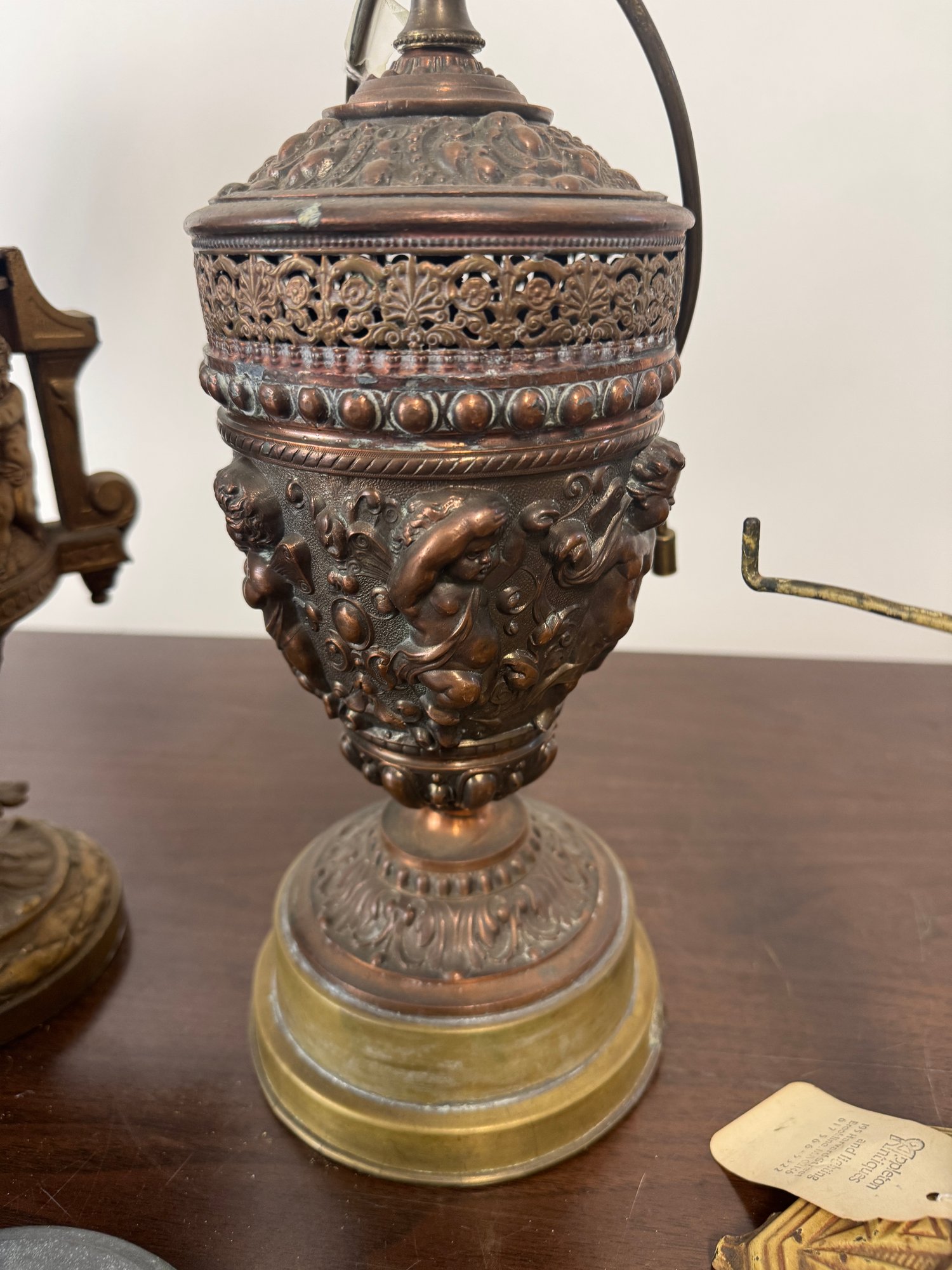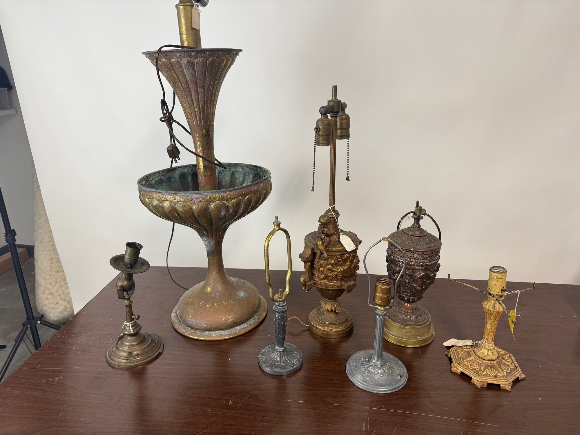 Seven antique metal table lamps unwired as found include cherub, tall fountain type, beautiful embossed scenes, etc. the tallest one is 32 inches