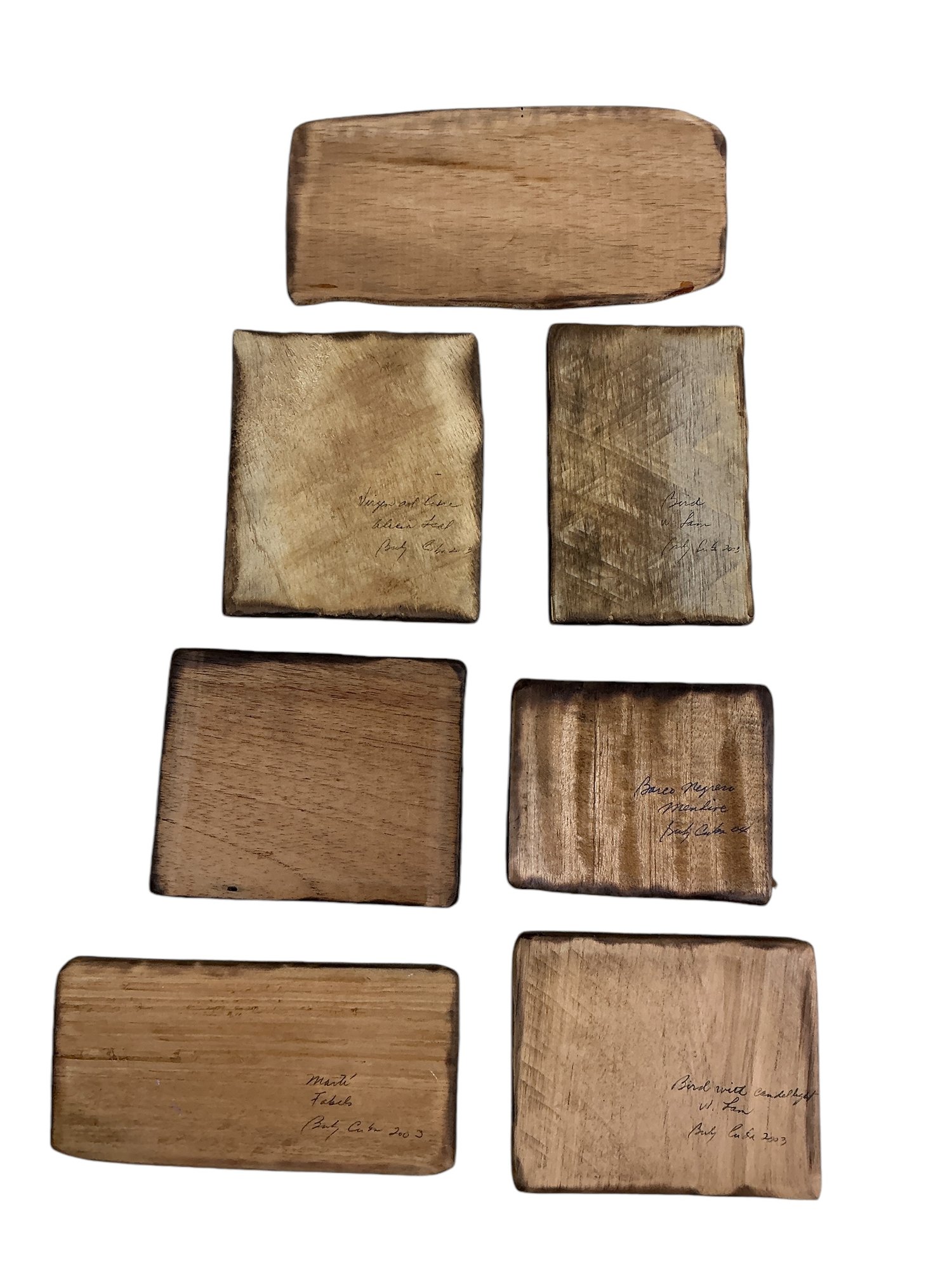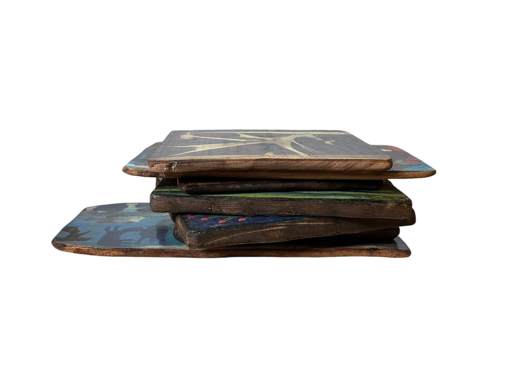 Lot Of Seven Modern Art Coasters. These are prints lacquered onto wood. Largest is approx. 9” by 4.5."