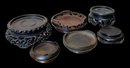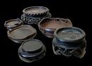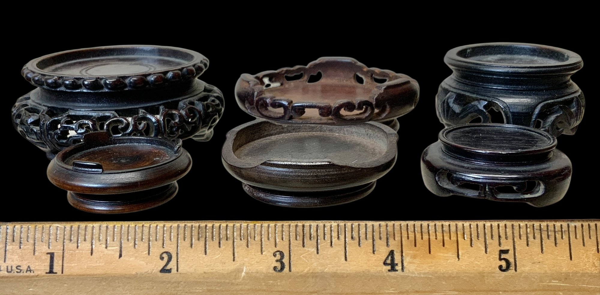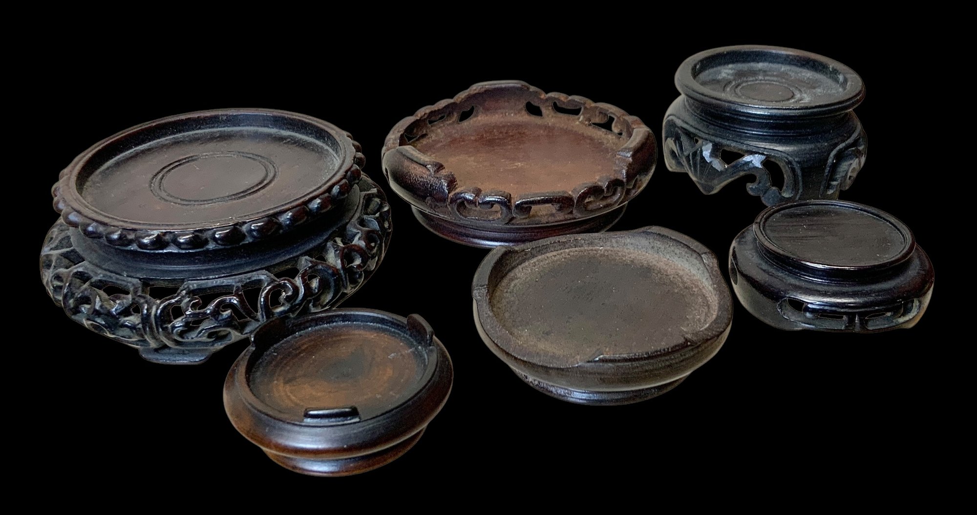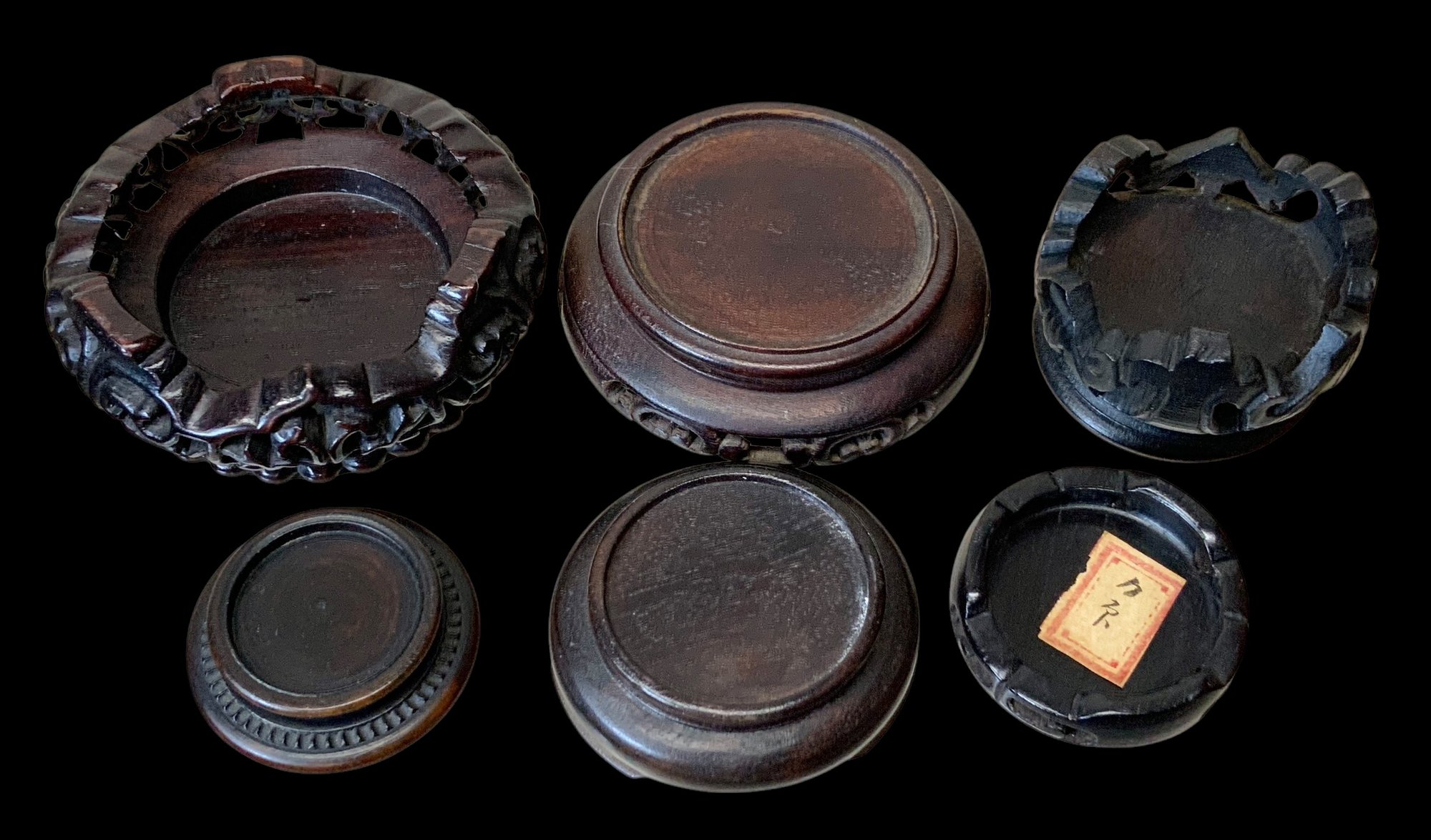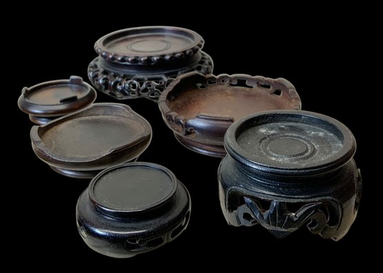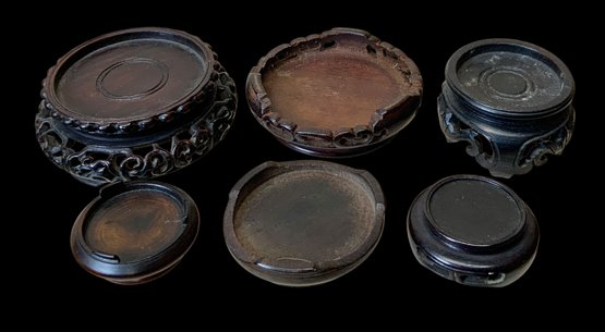Lot Of Six Antique Wooden Miniature Display Stands. Six miniature wooden stands meant to display miniature vases. Stands vary in size and shape, some with intricately carved legs. No visible cracks or chips, all in good condition. One stand has a stamp on the bottom with Chinese (?) characters written in ink. All stands measure approximately 2” in diameter or smaller.